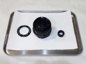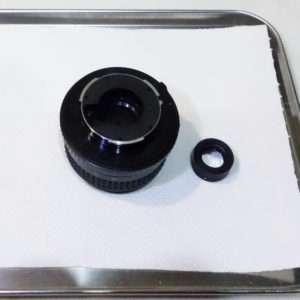 レンズに付いているホコリをブロワーで落としてからレンズクリーニングペーパーのつるつるしている表側を確認して少量のレンズクリーニングリキッドを染み込ませてレンズを清掃します。カビは種類によってどうしても取れないものがあるので、カビにはこだわり過ぎずにガラス面を綺麗に油脂を落としてホコリを残さない事を重点的に行います。カビはそれほど酷くなかったようでホコリや汚れも含めて綺麗になりました。レンズ類はクリーニング後もレンズのはずした上下をそのままにしておきます。(上下を間違えたまま組めてしまうレンズが結構あります)