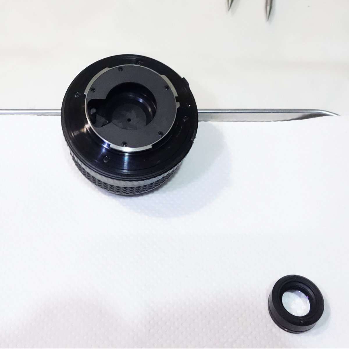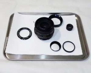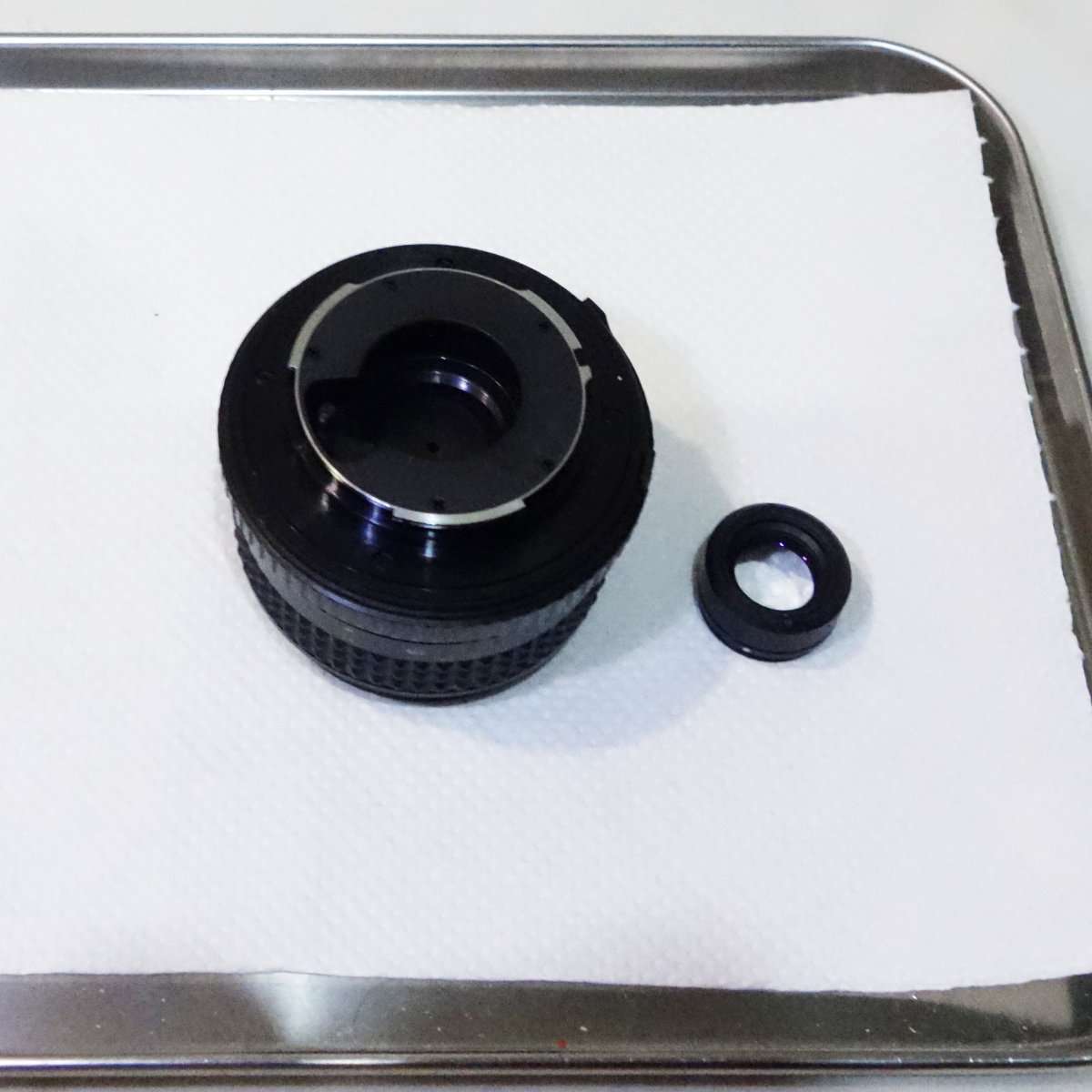 レンズの分解清掃では光学系のパーツに傷がつくのを避けるためと、細かいネジやパーツの紛失を防ぐためにトレーにペーパーなどをひいておきます。レンズの出っ張った面を下にする時はレンズペーパーをひくと傷が付きづらくなります。