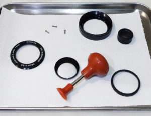 せっかく磨いたレンズを素手で触って指紋を付けてしまうと台無しなので、光学部分をレンズ本体に戻す際にはレンズサッカーを使用します。(手袋だとサイドに粉等が付いてしまいます)レンズサッカーでガラスパーツを持ち上げてレンズ本体に戻したら、外したパーツを再度取り付けてホコリが内部に入っていないかLEDライトで確認したら全てのパーツを固定します。ガラス部分は曲がって装着されてないか確認してネジ等も無理に締めないようにしましょう。