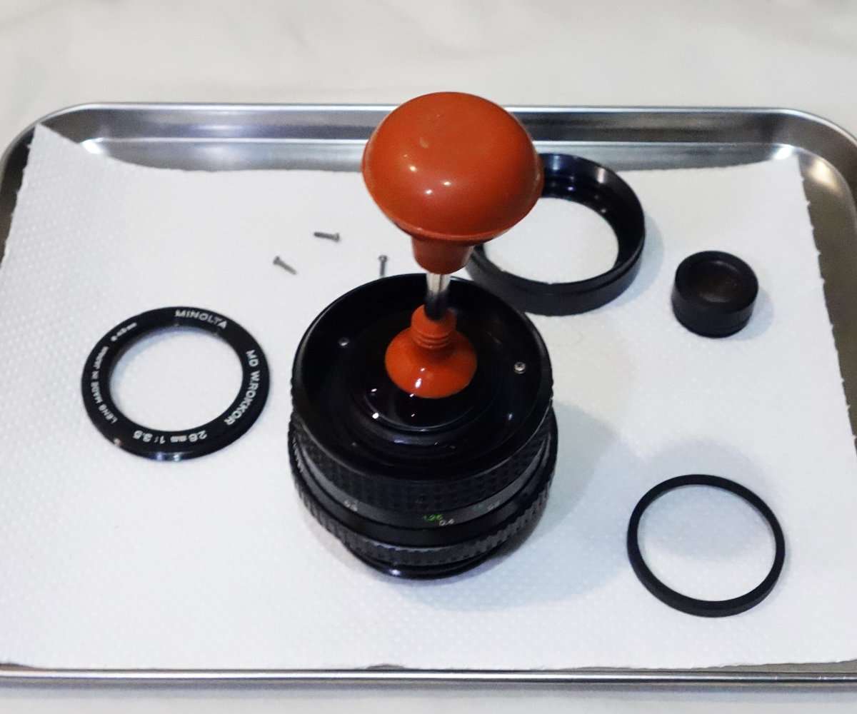 手に入れたミノルタMD Rokkor 28mm F3.5はヘリコイドや絞りなど全く問題ないのですが、レンズにLEDライトを当ててみると前後にホコリやチリと後ろに少しカビが見えるのでクリーニングする事にしました。