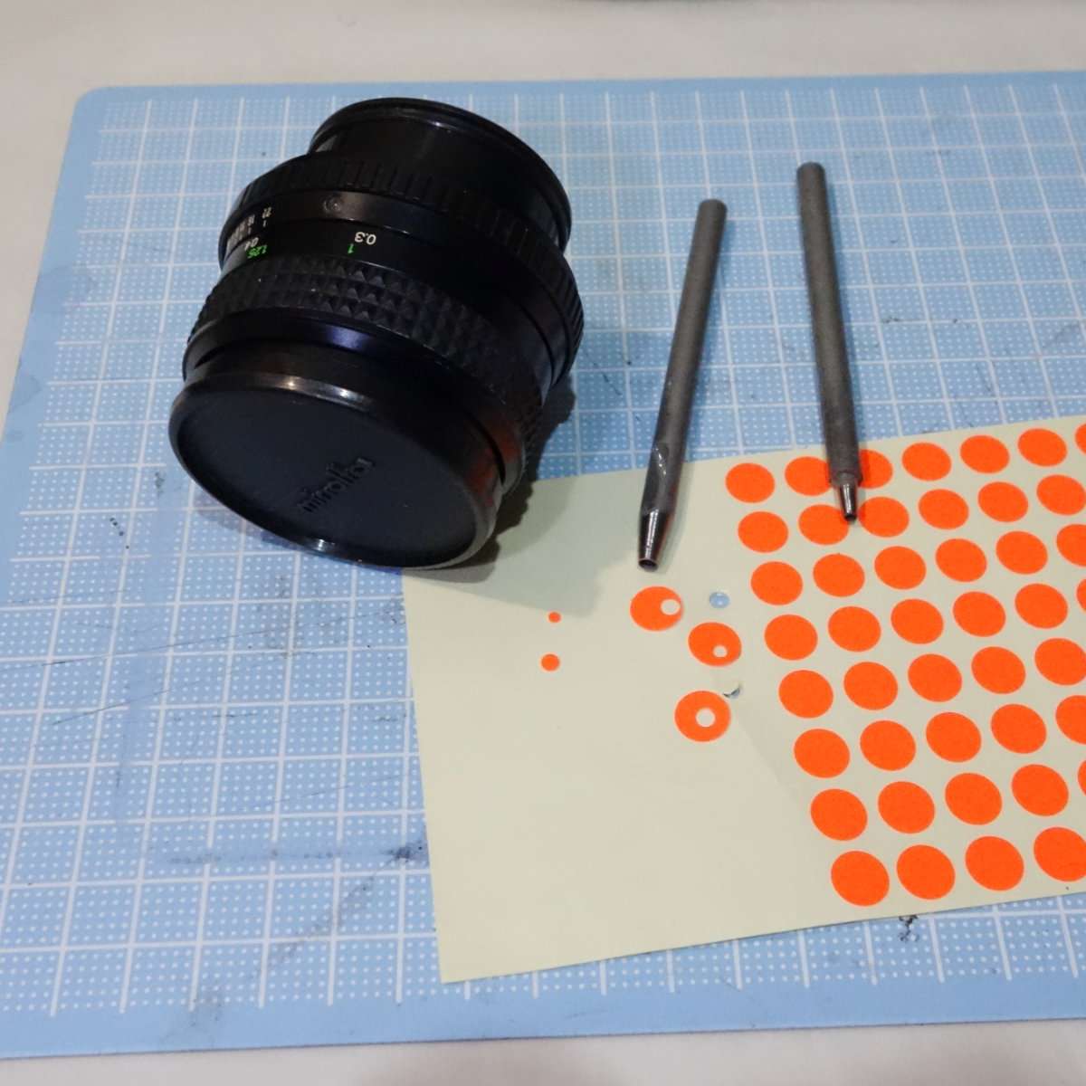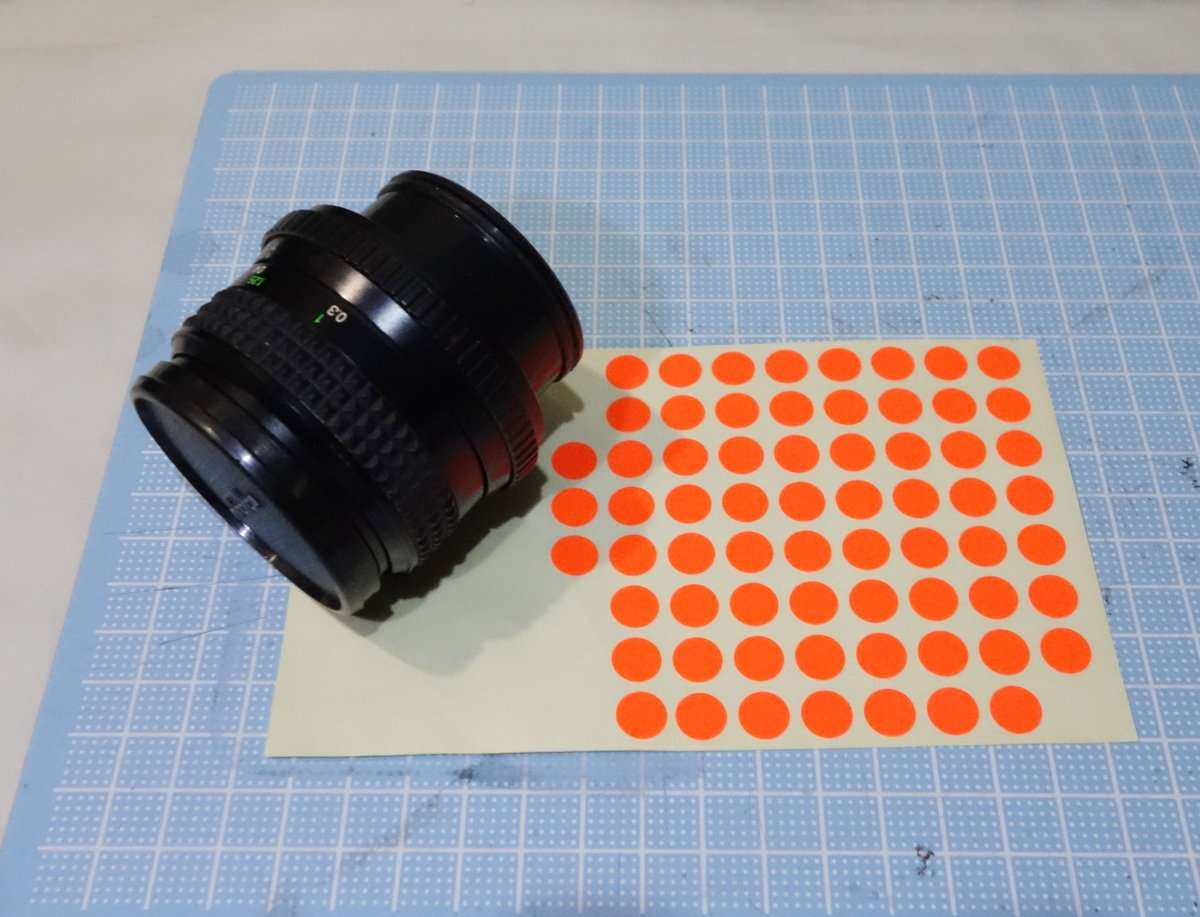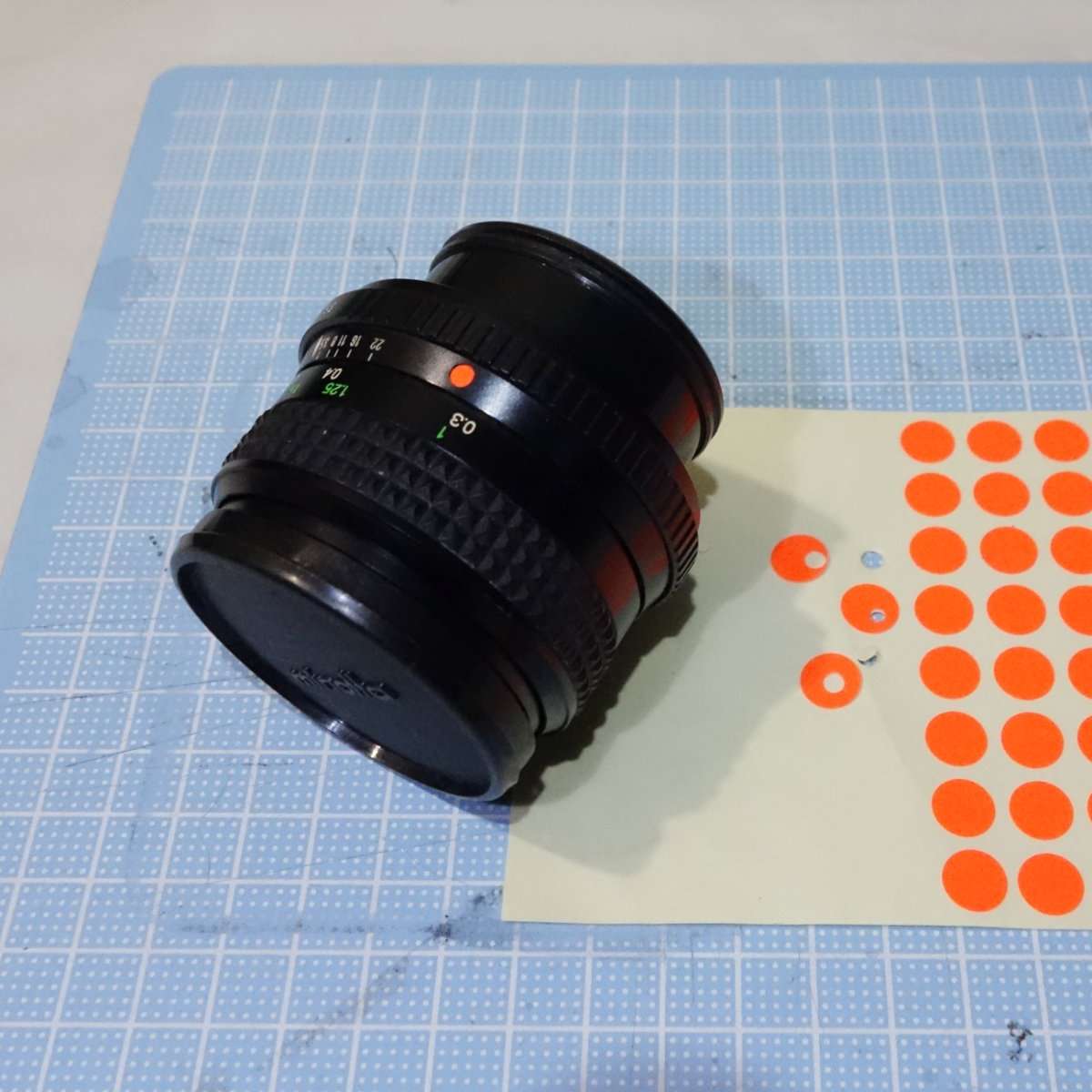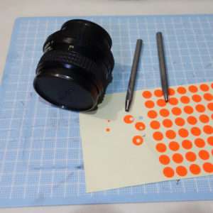 ジャンクレンズだっただけにレンズマウントに取り付けのため本体に付いているはずの赤い指標が外れていました。取り急ぎマーキング部分がわかれば良いので、蛍光オレンジのドットステッカーを切り抜いて貼り付ける事にしました。まずはステッカーを貼る前に貼る部分の接着をよくするために無水エタノールで脱脂します。ステッカーをレザークラフト用のポンチを使用して貼り付ける箇所のサイズに合わせて抜き取り、レンズ本体に貼り付けました。(この後に赤くリペイントし直しました)