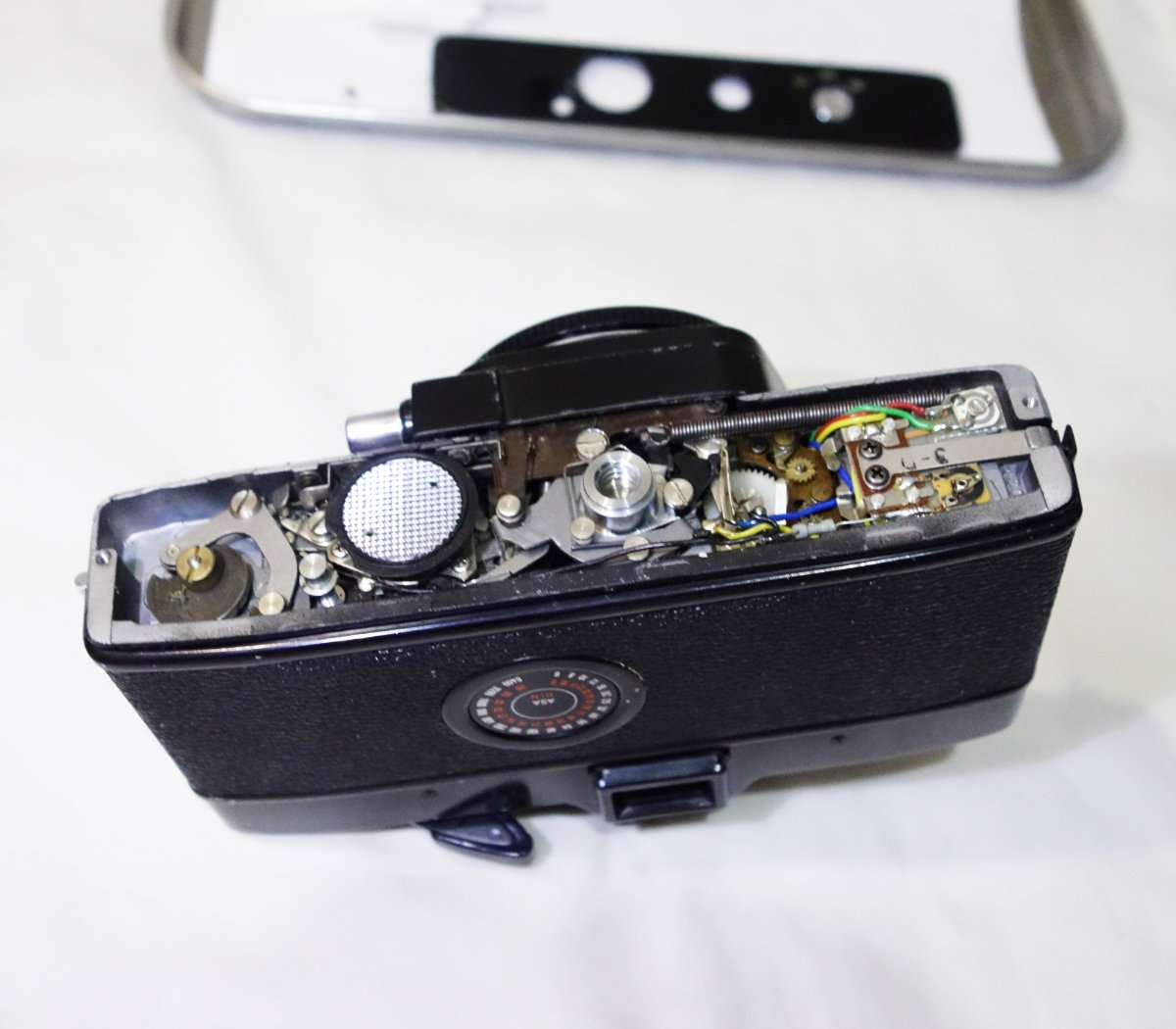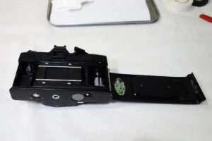 古いカメラでよくあるのがボタン電池の液漏れによる電池ボックスの端子の腐食ですが、このSR-T101の電池ボックスは綺麗でした。念の為電池ボックスも取り外して見えなかったパーツ部分の腐食などがないかを確認します。