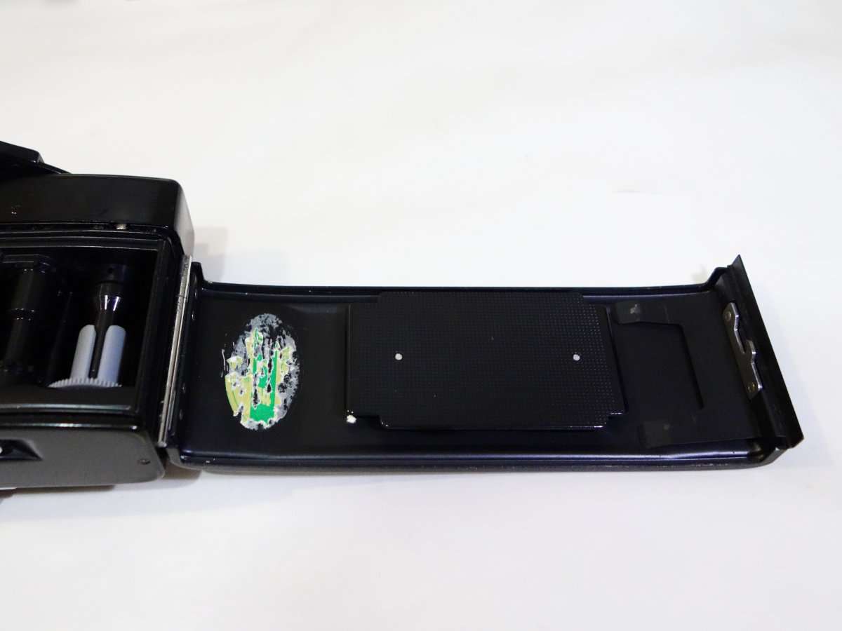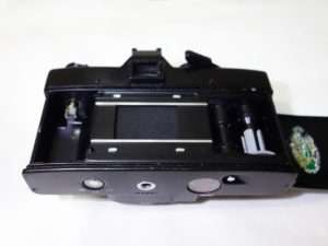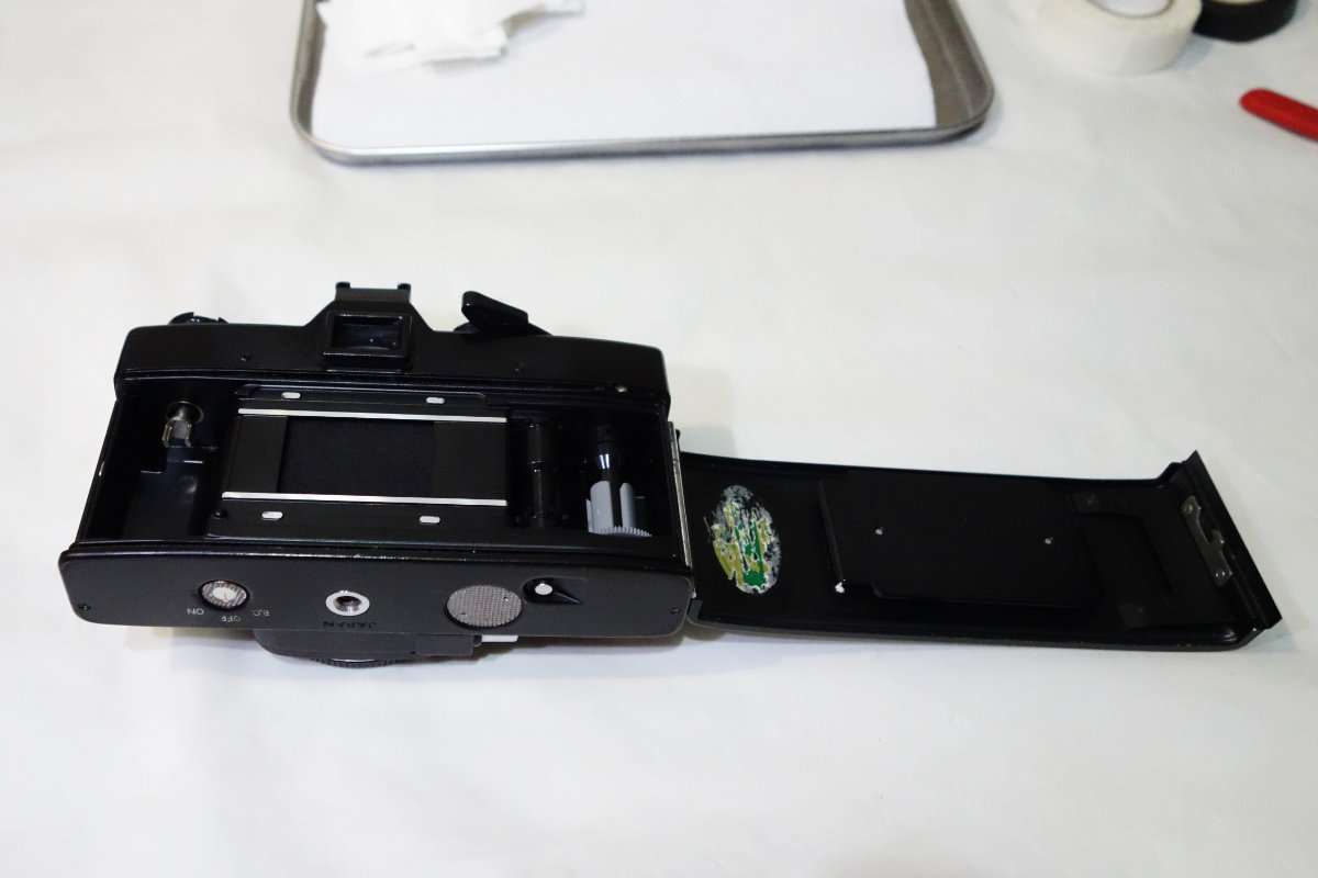 フィルム室を開けてみるとジャンクカメラの割には綺麗でモルトのカスが落ちてきたりせずそれほど酷い環境で放置されていなかったと思われます。あまりにフィルム室が汚れている場合はゴミなどがシャッター幕やギアなどに入ってしまうため先に清掃した方がよいですが、今回はモルトを貼り替えの時に清掃する事にします。