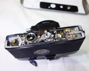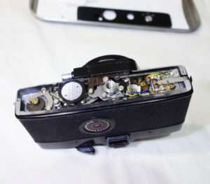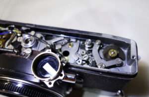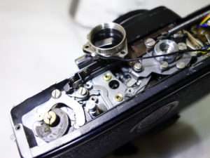 底カバーはカメラ底面のネジを外すだけで簡単にはずせます。底カバーをはずしたら各パーツが固着していないかシャッターをチャージして切って問題なく動いているかを確認します。カメラ整備のネジを外すにはベッセルの細軸ドライバー(ねじ回し)が1つあればほぼ全てに対応が可能です。