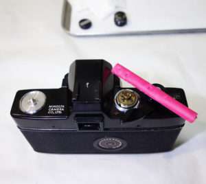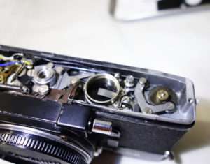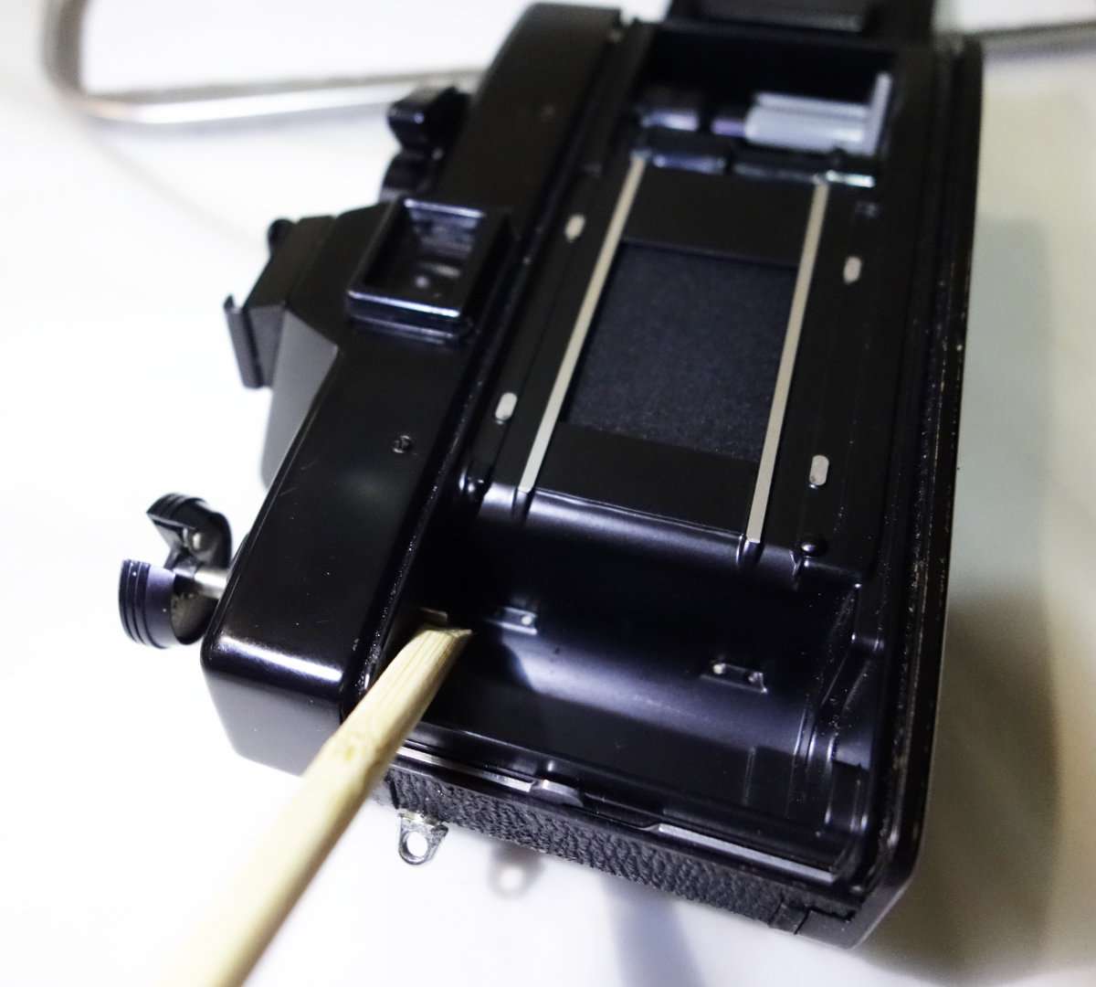 トップカバーを外すためにまずは巻き戻しクランクレバーを取り外します。フィルム室を開けてクランク根本の二股部分に割り箸などを挟んでクランク全体を回すとクランクパーツ自体を取り外せます。クランクのレバーをつまんで回すと負荷がかかってレバーが折れてしまう事があるので、クランク全体を回すようにしましょう。フィルム室側のパーツも金属疲労で折れてしまう事があるのでパーツを最初に外す場合はパーツ破損に気をつけましょう。何より多くのクラシックカメラが40年以上経っていてパーツがヘタっていたり金属疲労がある事を忘れないようにしましょう。
