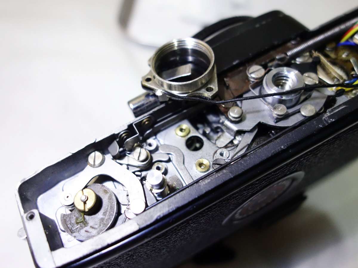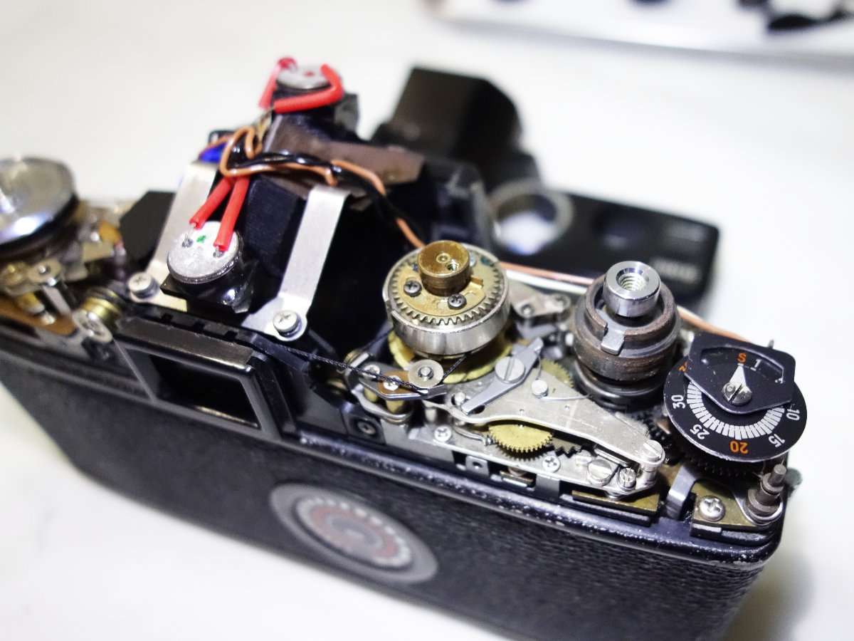 底面にあるマイナスネジになっている真鍮(金色)のギアはシャッター幕の調整用ネジになります。このネジを回転するとシャッタースピードを調整出来るので、シャッター幕が緩んでいたりあまりにシャッタースピードがおかしい場合には調整をしましょう。調整の仕方なども含めてカメラの整備用マニュアル(サービスマニュアル)を手に入れておくとよいでしょう。