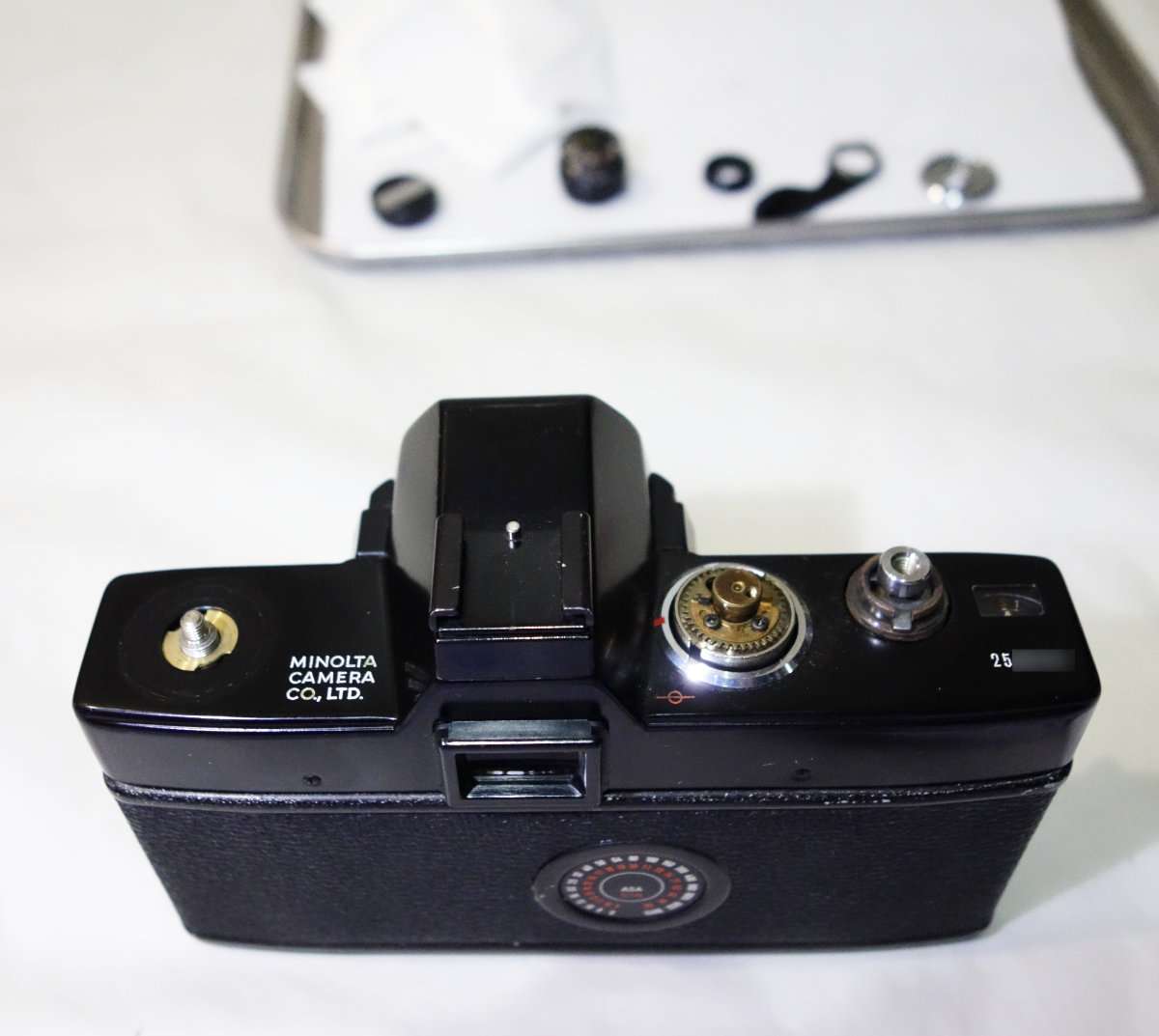 このSR-T101に限らずシャッタースピードやASA(ISO)ダイヤルを取り外す場合は取り外す時のシャッタースピードとISOの数値のメモをしておきましょう。基本的には最大の数値にしておく癖をつけておくとよいでしょう。ミノルタSR-T101であればシャッタースピード1/1000、ISO6400に設定してからパーツの取り外しをします。