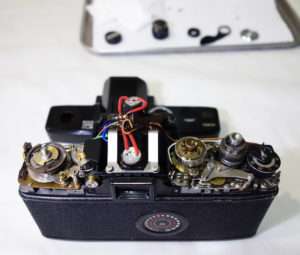 トップカバーに付いていたパーツとペンタプリズムカバーのネジを外すとトップカバー全体を取り外す事が出来ます。トップカバーを取り外したら内部の各パーツに問題がなく糸が切れていないかを確認します。