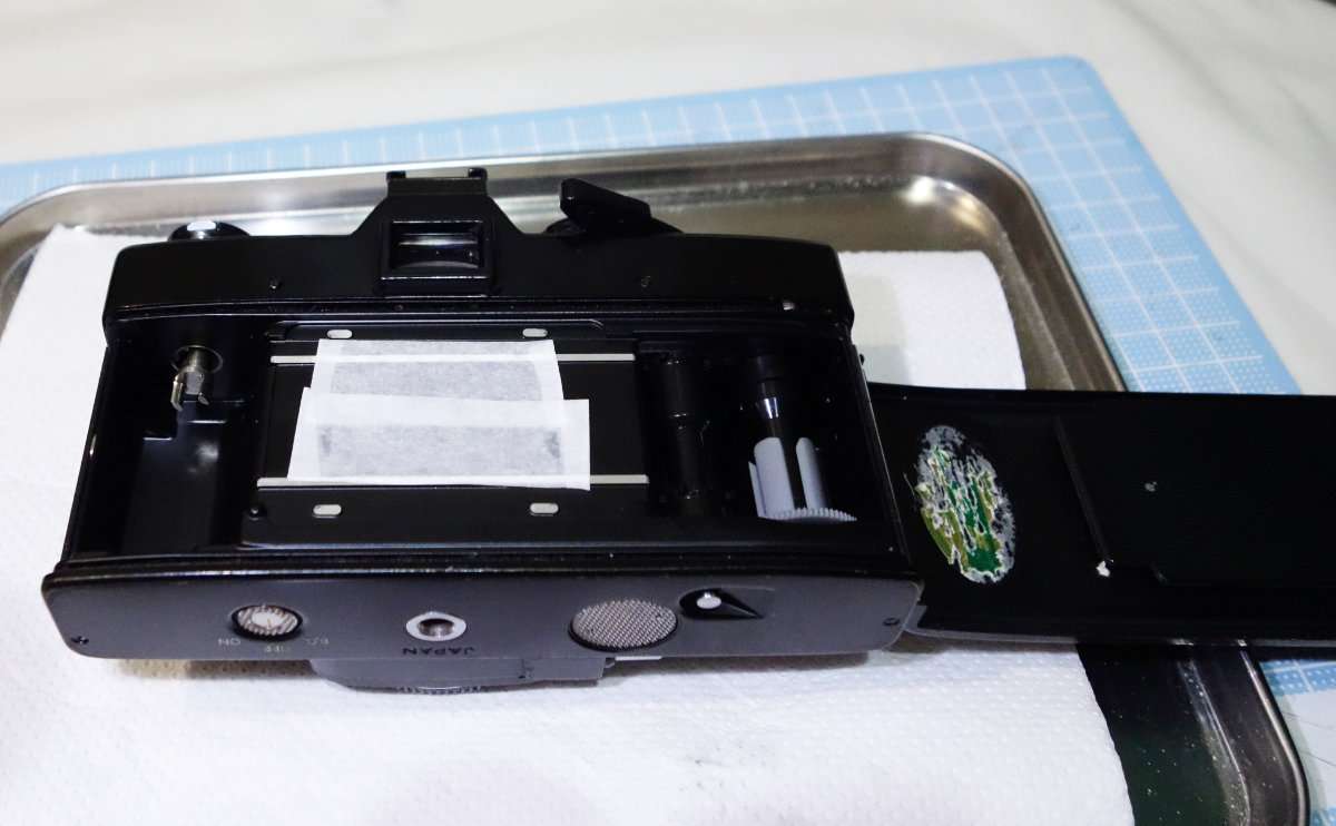 機関部分の動作は確認して問題なさそうなので、フィルム室のモルトを全て貼り替えてしまいます。まずは古く劣化したモルトを剥がす際にシャッター幕にゴミやチリが入らないようにマスキングテープなどで養生をします。モルトは接着剤で貼ってあった場合は全てを剥がすのは大変ですが、両面テープの場合は比較的剥がしやすいです。古いモルトが剥がれにくい場合は無水エタノールをコスメ用の注射器に入れて濡らしながらやると綺麗になります。