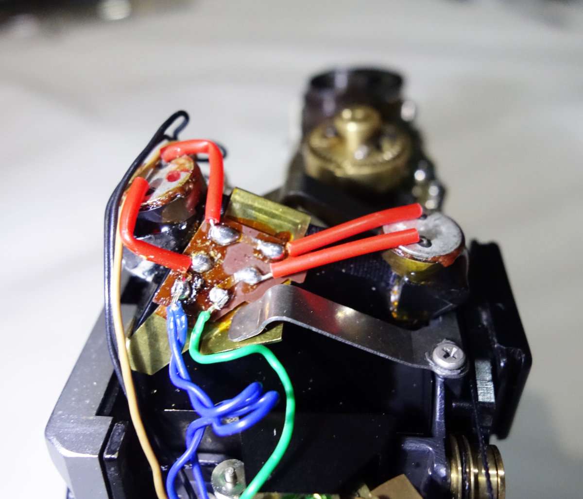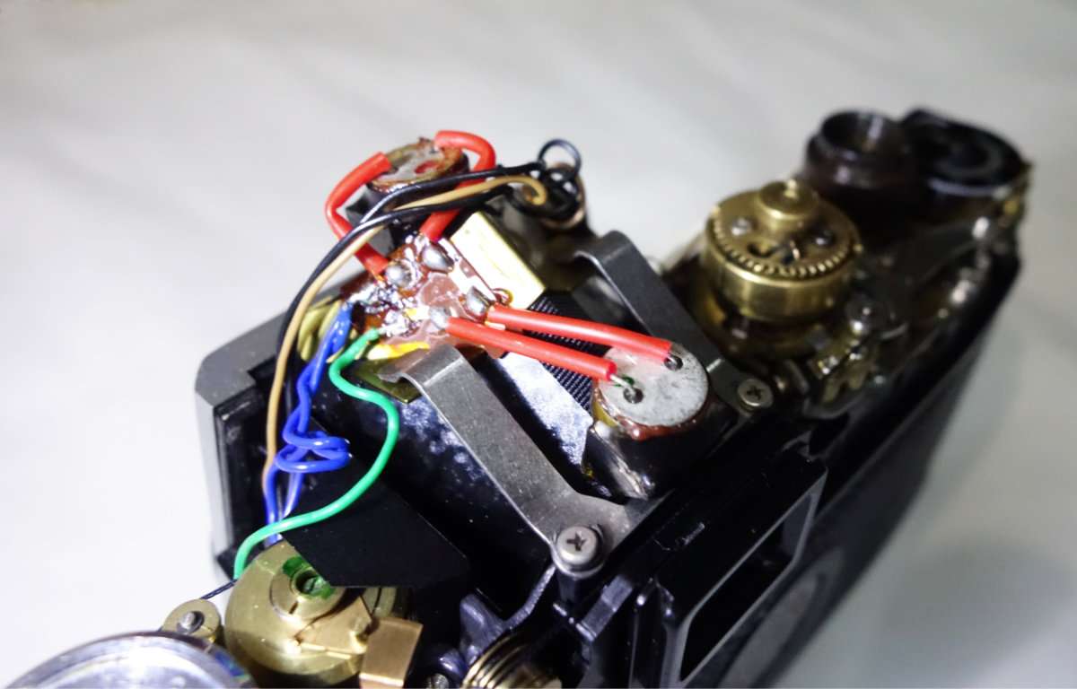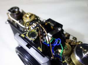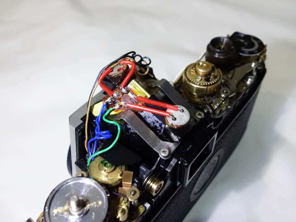 まずは用意したCdSで露出計が動作するかを確かめるために絶縁チューブは使わずCdSセルをミノルタSR-T101に半田付けします。CdSを交換して電源を入れるとあっさりと露出計が動き出しました。トップカバーを外した状態だとプリズムの上からも光が差し込んでしまうので、露出の調整は全てのパーツを組み立ててからになります。