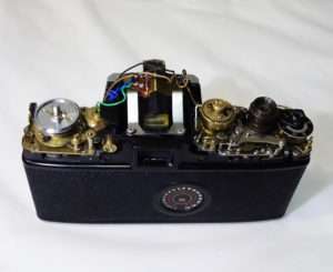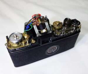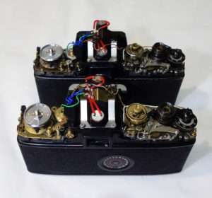 ちょうどSR-T101ブラックの整備もしていたのでシルバーと比べてみます。SR-T101の色違い2台を比べてみると、各パーツは同形状なものの真鍮とシルバーで色が違うパーツが多くあります。修理するカメラからパーツを取り外したりする場合は、配線やパーツの向きなどがわかるのでもう一台同じカメラ(ジャンクカメラ)を用意しておくと安心です。