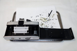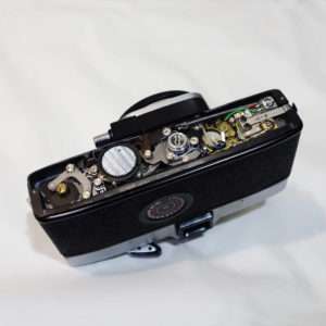 ジャンクカメラは長く放置されていただけにフィルム室には古くなったモルトのカスなどが散乱しています。いきなり清掃してしまうとトラブルの元になるので、まずはフィルム室を下に向けてゴミなどを落とします。ほとんどのゴミが出たらブロワーでチリなどを飛ばします。ブロワーの基本は吸う事なので、いきない吹くとゴミなどが奥に入ってしまうので気をつけましょう。