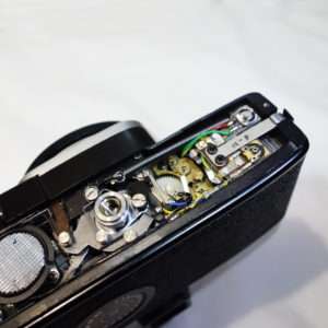 かなり根気がいりますが、細かい部分まで全てのモルトを剥がしてフィルム室と裏蓋を綺麗に仕上げます。まだシャッターなど動かない部分があるので、モルトの貼り直しはカメラを修理をしてからにします。