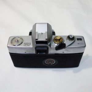 トップカバーをはずすにはカメラ上部にあるダイヤルやレバー類をはずす必要があります。まずは左側の巻き戻しクランクをはずします。そのままだとグルグル回るだけなので、裏蓋を開けてクランク軸に割り箸など柔らかめのものを挟んでロックしてはずします。この時クランクのレバーで回してしまうと古いパーツのため金属疲労などで折れてしまう事があるので、全体を掴んで回すようにしましょう。