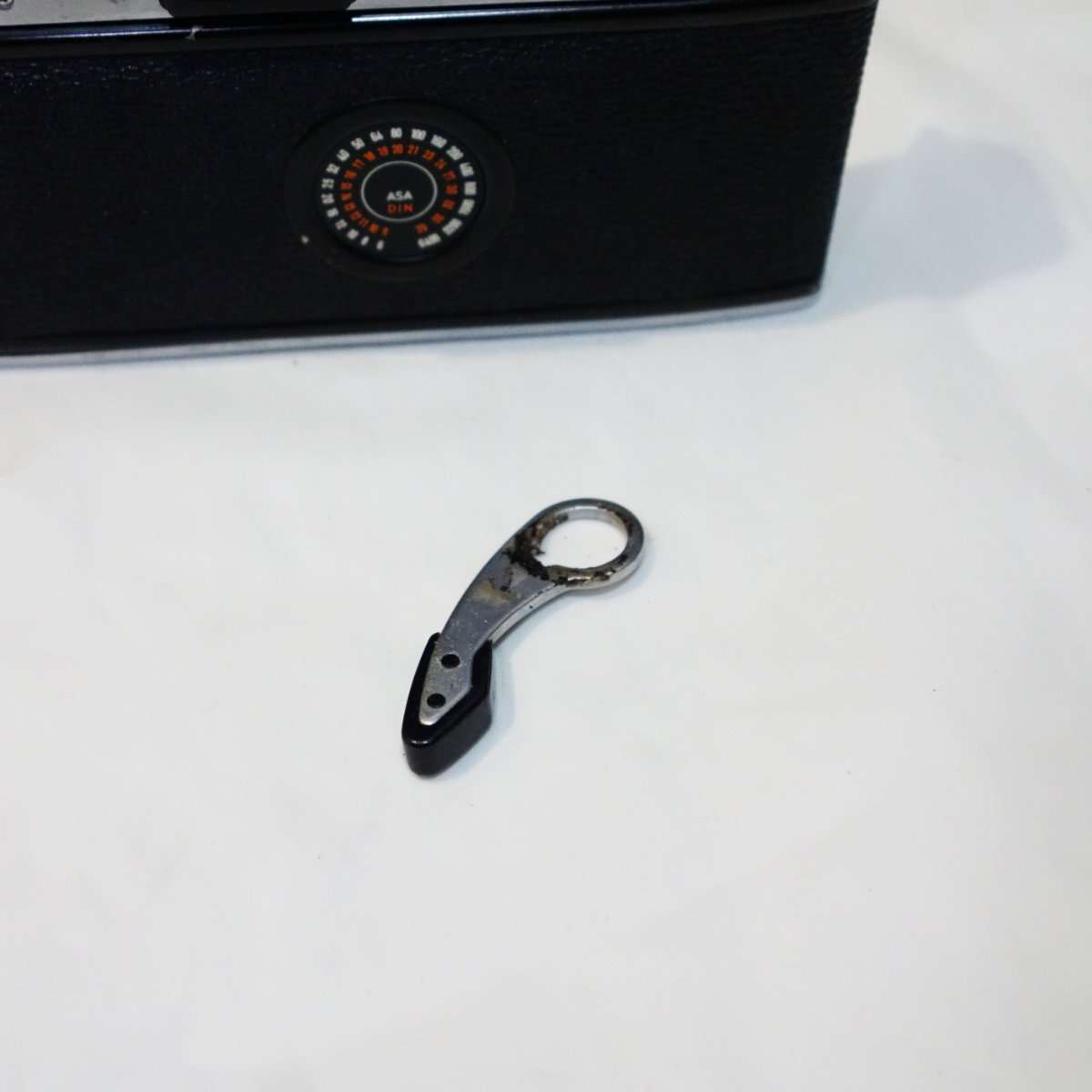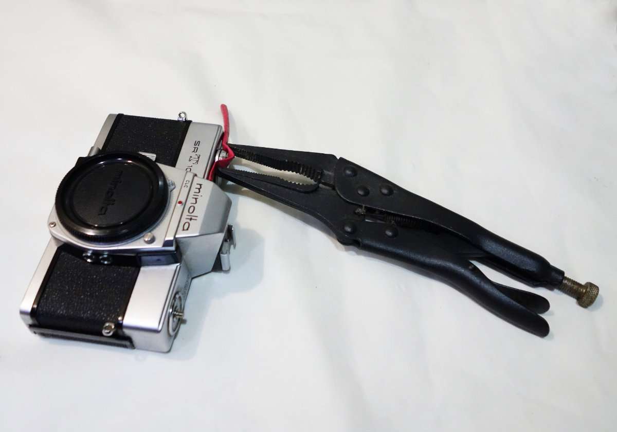 シャッターをチャージする巻き上げレバーの取り付け部分はカニ目になっていないので、ゴムなどで養生しながらプライヤーで取り外します。バイスプライヤーだと掴んだ状態でロック出来るので簡単に取り外せますが、吸盤オープナーを使うのもよいと思います。(ネジが固着していると吸盤オープナーではきついですが)