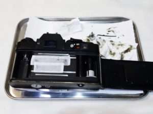 基本的な動作に問題はないですが、一応底蓋を外して電池ボックスの腐食やオイルやグリス切れがないか確認します。汚れているようであれば無水エタノールやベンジンを使ってパーツをクリーニングします。カメラは車やバイクと違って最小限でもオイルは多すぎるくらいなので、間違っても556など潤滑剤のスプレーを吹き掛けたりしないようにしましょう。無水エタノールやベンジンを使用する時には別皿に移してコスメ用の注射器に入れてごく少量のみ使用します。