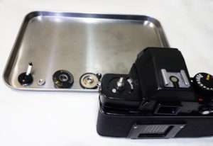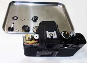 古い海外製の車やバイクなどはよく壊れるところが決まっていたりして、そこさえ直せば新車のように戻りますが、古いカメラにもよく壊れるいわゆる持病と言う箇所があったりします。ミノルタXEの場合はAEやシャッタースピードの不安定さがよくトラブルとしてあげられ、ほとんどの原因が巻き戻しクランクの下にある基盤の汚れと劣化なので、トップカバーを外して基盤を清掃していきます。