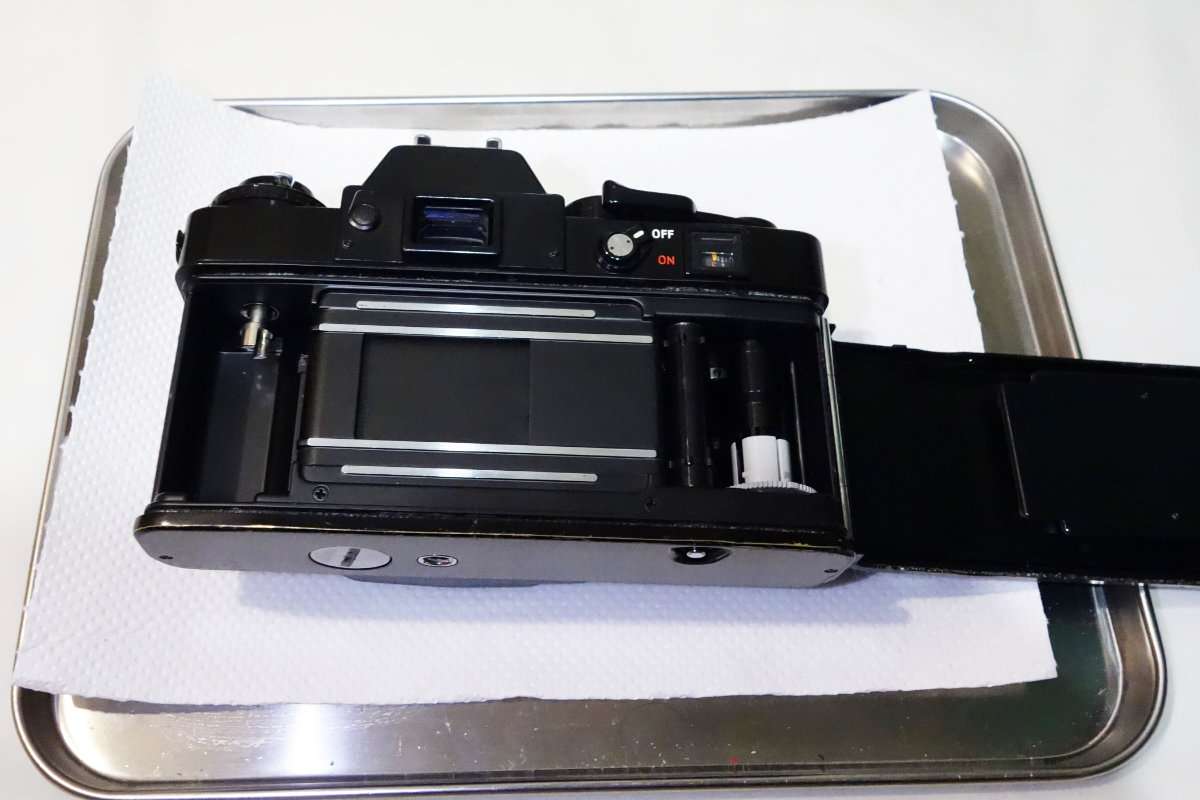 フィルム室のゴミやチリは全て綺麗にするのですが、モルトが貼られていた部分に関しては元々モルトが貼ってあった部分がわかる程度にしておくと、あとで貼り替える時に楽になります。もちろん最初に貼られているモルト部分の写真を撮っておいたりメモをしておくのもよいでしょう。たまに腐食ではなくモルトも接着剤などもが完全に乾燥して何もなくなっていて貼られている場所がわかりづらい事もありますが、カメラの仕組みをみてみれば大体貼る箇所の見当はつきます。整備やモルトを貼った後はいきなり大事な撮影をせず安いフィルムで試写を必ずしましょう。
