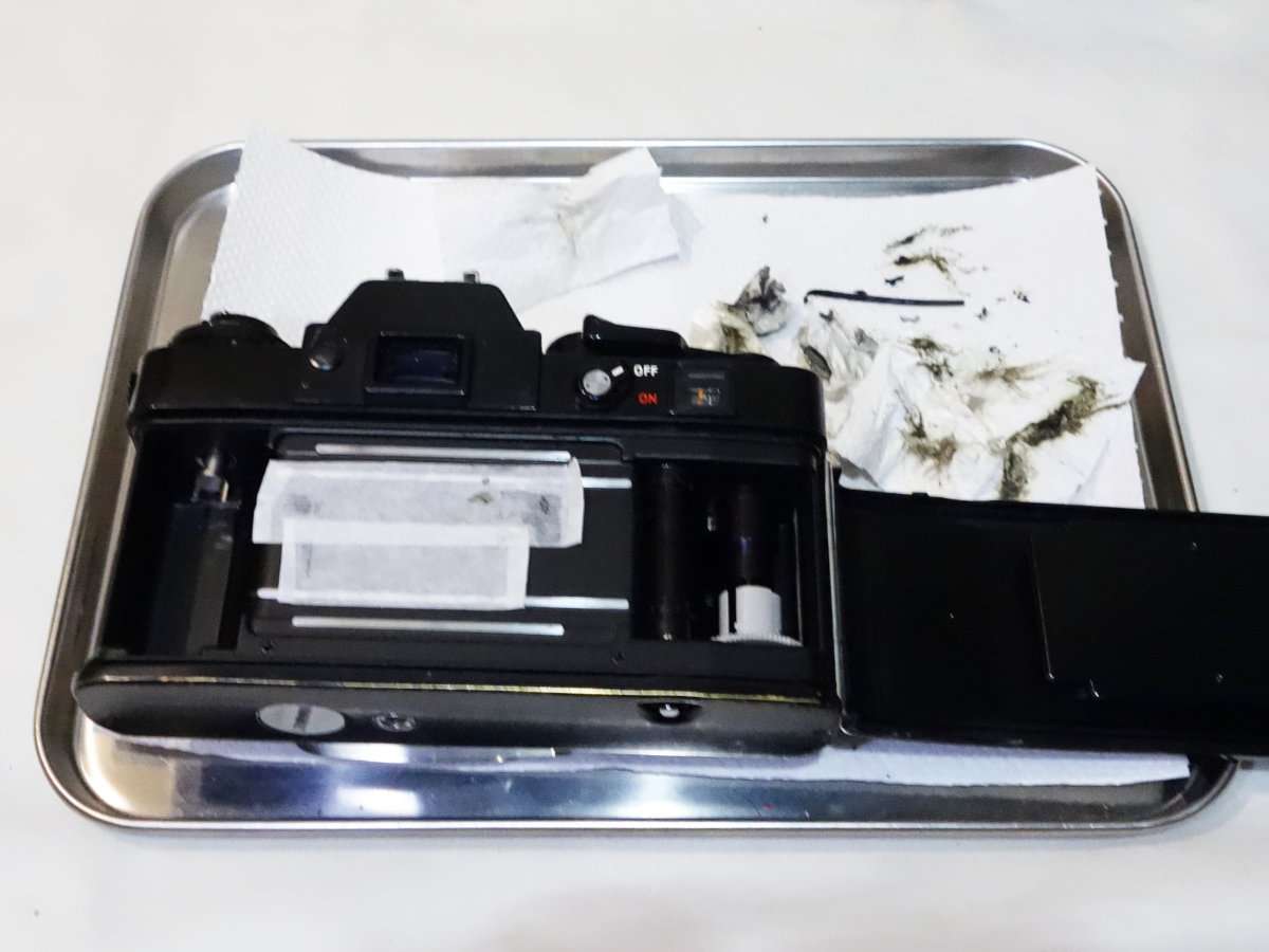 シャッターの不安定さを直したいところですが、後でモルトをどのみち張り直すのでフィルム室からゴミなどがシャッター幕やミラー側に挟まったりしないように先にフィルム室内を綺麗にしてしまいます。まずはシャッター幕を触ったりゴミが付かないようにマスキングテープなどで養生をします。養生をしたらまずフィルム室を下に向けてゴミなどを出しながらブロワーでホコリや細かいチリなどを落とします。細い溝に古いモルトを剥がします。モルトを剥がすにはテープを使用している場合などは無水エタノールを少量垂らすと楽に綺麗にする事が出来ます。(接着剤を使われている場合は固着した部分を削りましょう)