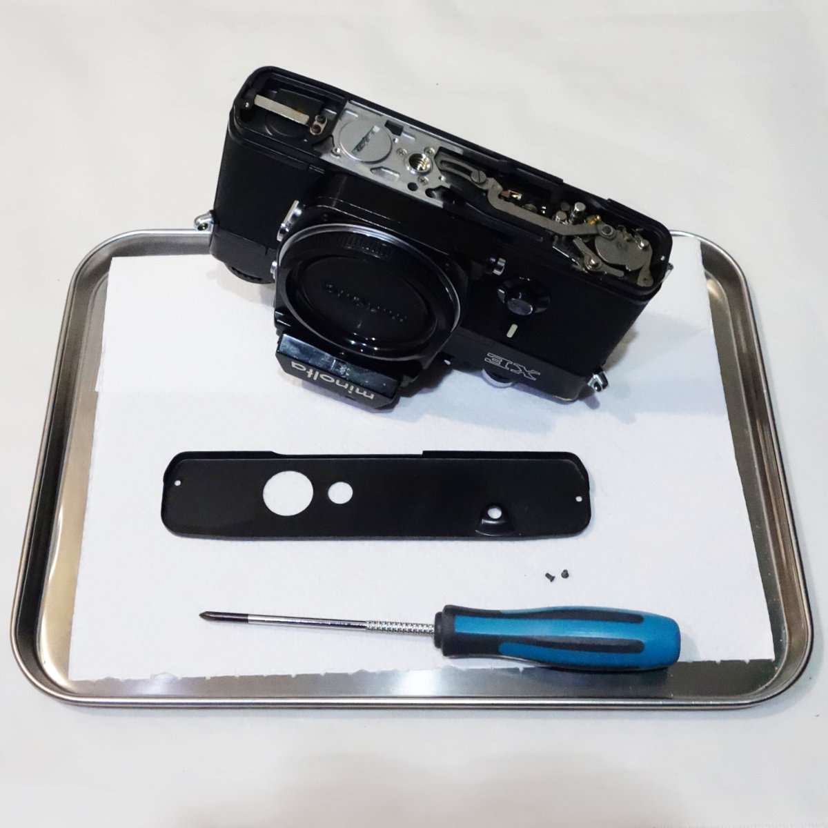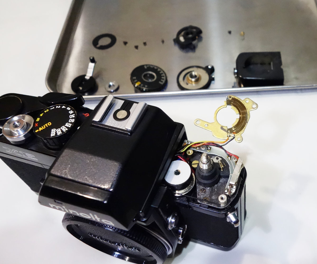 古い海外製の車やバイクなどはよく壊れるところが決まっていたりして、そこさえ直せば新車のように戻りますが、古いカメラにもよく壊れるいわゆる持病と言う箇所があったりします。ミノルタXEの場合はAEやシャッタースピードの不安定さがよくトラブルとしてあげられ、ほとんどの原因が巻き戻しクランクの下にある基盤の汚れと劣化なので、トップカバーを外して基盤を清掃していきます。