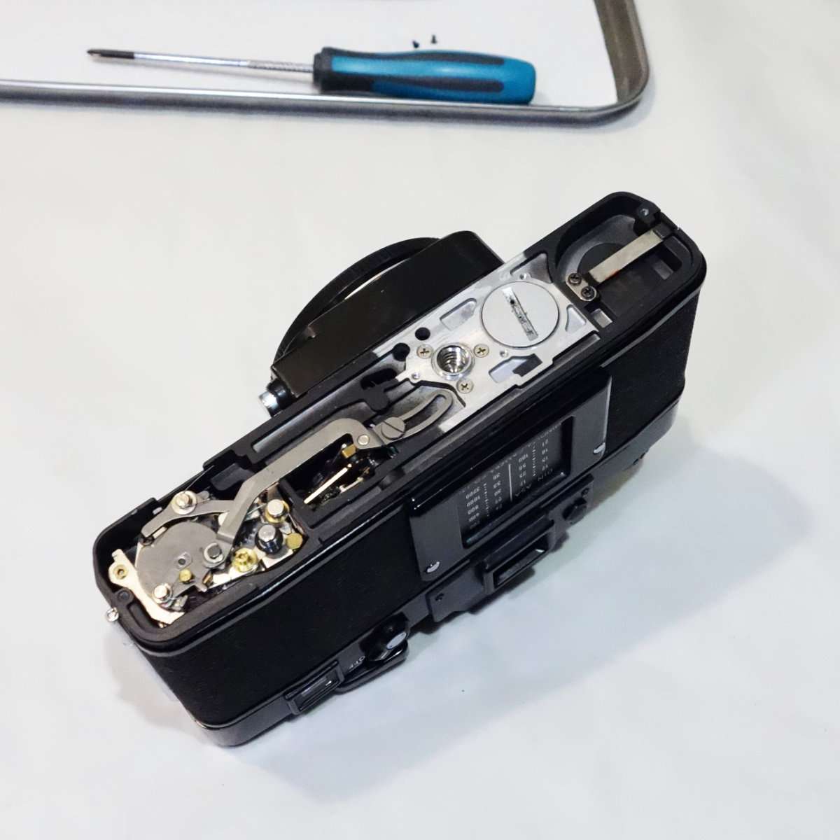 基本的な動作に問題はないですが、一応底蓋を外して電池ボックスの腐食やオイルやグリス切れがないか確認します。汚れているようであれば無水エタノールやベンジンを使ってパーツをクリーニングします。カメラは車やバイクと違って最小限でもオイルは多すぎるくらいなので、間違っても556など潤滑剤のスプレーを吹き掛けたりしないようにしましょう。無水エタノールやベンジンを使用する時には別皿に移してコスメ用の注射器に入れてごく少量のみ使用します。