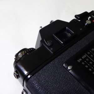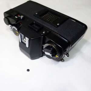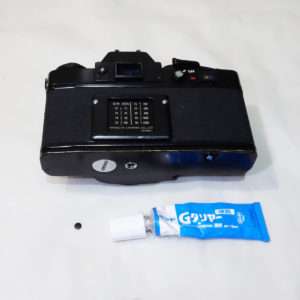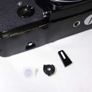 セルフタイマーのレバーの接着を待つ間に取り外していたファインダーシャッターレバーの取り付けネジにカバーを取り付けます。これまでは露出調整やファインダーの清掃のためにペンタプリズムカバーをよくはずすためカバーを外しっぱなしにしていましたが、露出も安定して撮影出来るようになり頻繁にカバーを取り外さなくなったのでこの機会に塞いでしてしまいます。