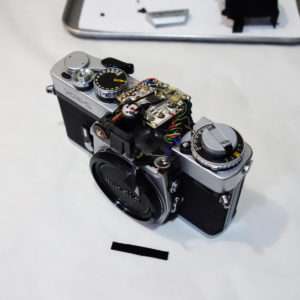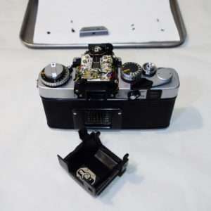ペンタプリズムにある基盤のファイダー寄りのところのネジをはずすとプリズムを押さえているステーを取り外す事ができます。この状態で基盤全体を持ち上げるとプリズムにアクセスが出来るようになるのですが、古いカメラで配線などが硬くなっているのでゆっくりと持ち上げます。この時代のカメラの整備でつきまとうのは金属パーツ類の故障よりも線材と古い接着剤の劣化でパーツが取れたり脱落したりすると処理がかなり大変になります。