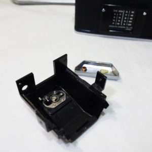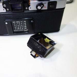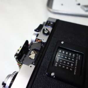 ファイダーの左にはファイダーシャッターレバーを取り付けているネジがありますが、黒い小さいパーツでカバーされています。このカバーを取り外すとファイダーシャッターを取り付けているマイナスネジが出てきます。このカバーは接着剤などで取り付けるので露出調整やファイダー清掃などを頻繁にするのであればカバーは取り外したままにしておく方がメンテナンス性は高くなります。小さいパーツなのでぐれぐれも無くさないよう、長期間取り付けないのであればフィルムケースなどに入れてパーツ名を記載して保管しておきましょう。