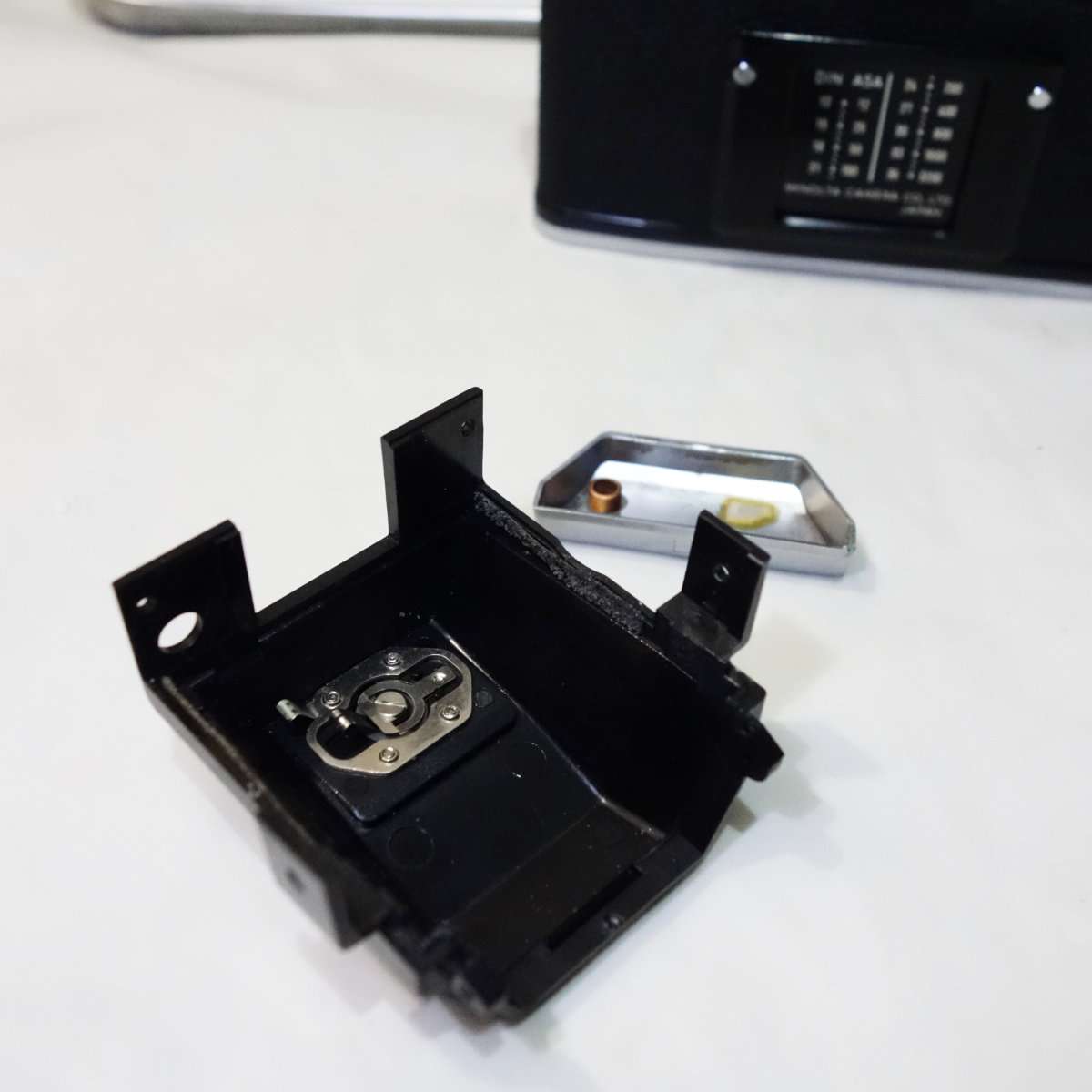 カメラ前面にあるminoltaと書いてあるロゴカバーを取り外します。ここにもモルトが使用されているので後ほど貼り替えます。(日本製のカメラはモルトだらけです)