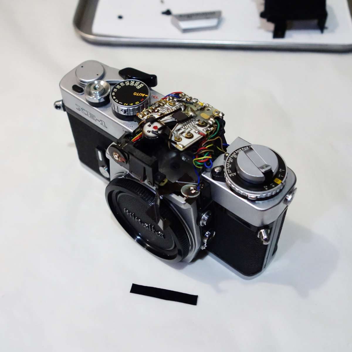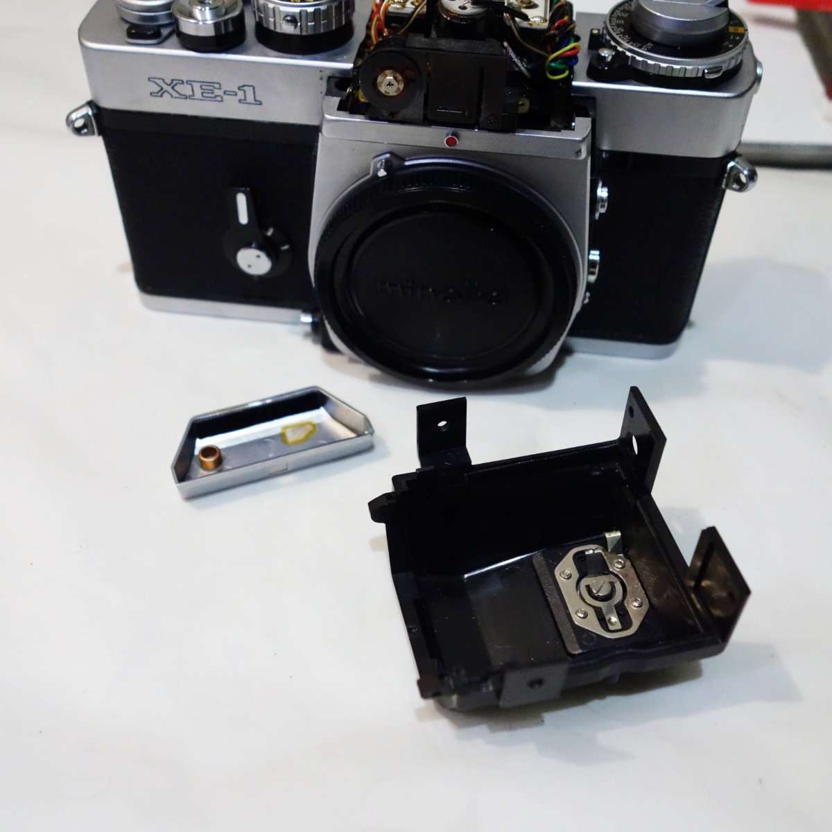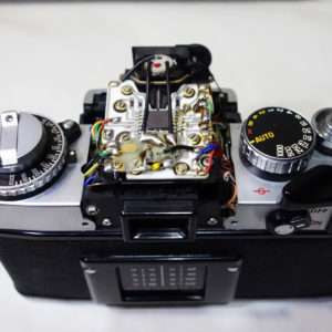 ミノルタXE-1の中央のトップカバーであるペンタプリズムカバーを取り外すと基盤が現れて露出の調整が可能になります。更にその基盤を外すとペンタプリズムが取り外せ、プリズムを押さえているモルトを交換する事によってプリズムの腐食の防止します。