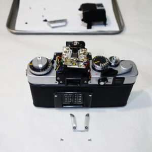 ペンタプリズムカバーの取り付けには細かいネジが使われているので、絨毯の上などに飛ばして無くさないように気をつけながら外します。ペンタプリズムカバーにもモルトが使用されているので取り付ける前にモルトの交換をします。