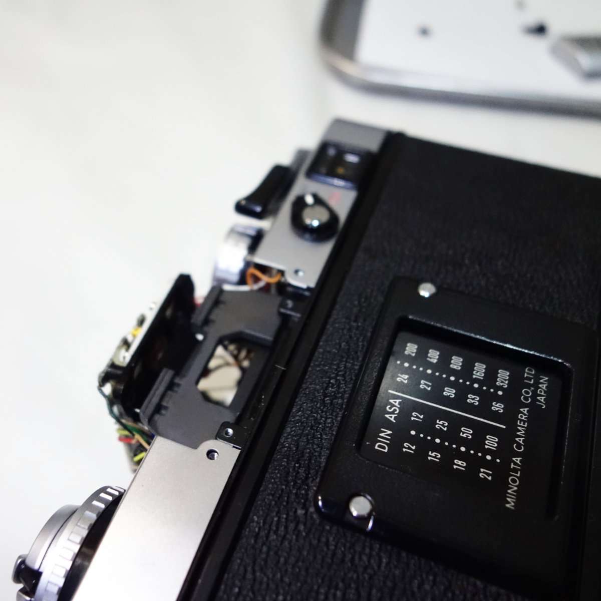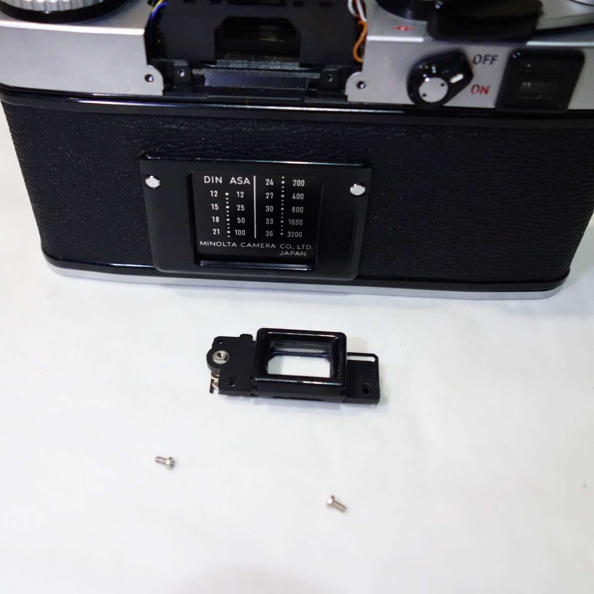 ペンタプリズムカバーとロゴの書いてある部分にある古いモルトを取り除き、無水エタノールで洗浄したら新しいモルトを貼り付けます。ファイダーを覗きながらチリやホコリが入っていないか確認しながら最後に全てのカバーを取り付けます。ミノルタXE-1はオリンパスOM-1の様にカメラマウント側からフォーカシングスクリーンが取り替えられないのでこの段階で確実にファイダーを清掃しておく必要があります。