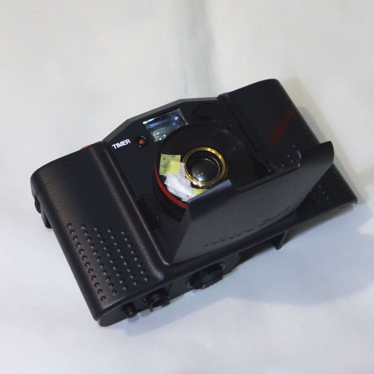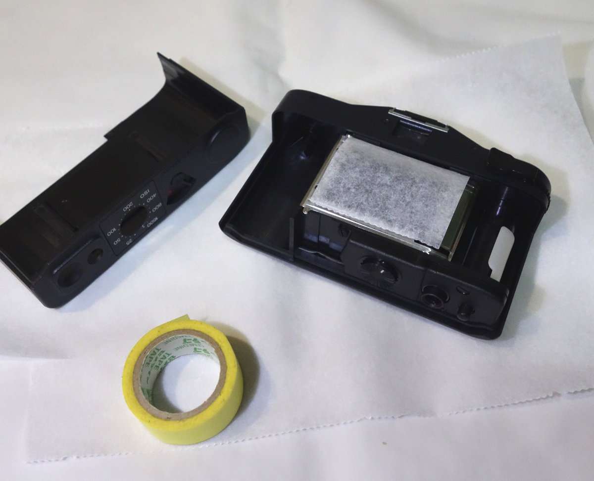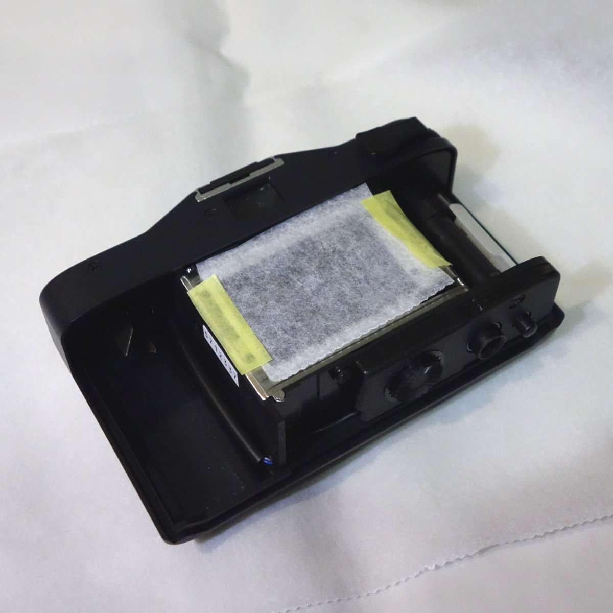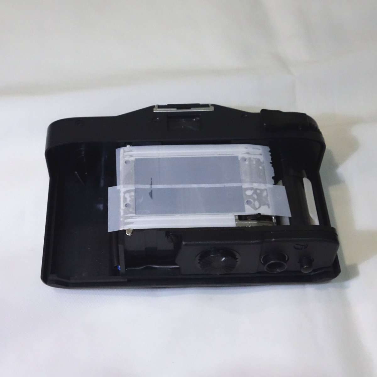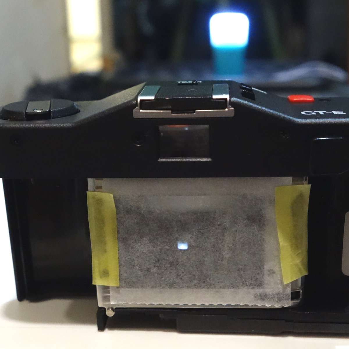 カメラにバルブ機能があればシャッターを開きっぱなしに出来て楽にフォーカス調整が出来るのですが、コンパクトカメラやこのMinox 35にはバルブがありません。そこで露出計をカバーして暗い状態だとカメラに思い込ませます。Minox 35はレンズ沈胴前面の前からみて左側にCdSがありそこで露出を測っています。そこにテープを貼ることでカメラは真っ暗と勘違いします。35GT−Eも含め35GT以降のモデルには露光時間を2倍にする機能があり、ケース上部分にスイッチがあるのでそのスイッチもオンにしておきましょう。これで