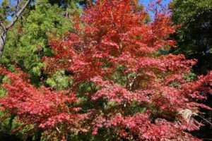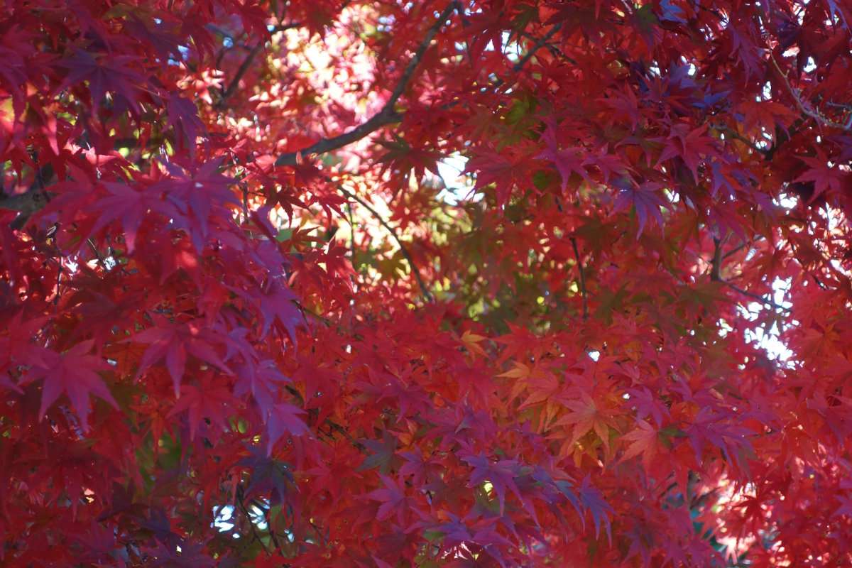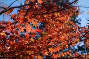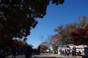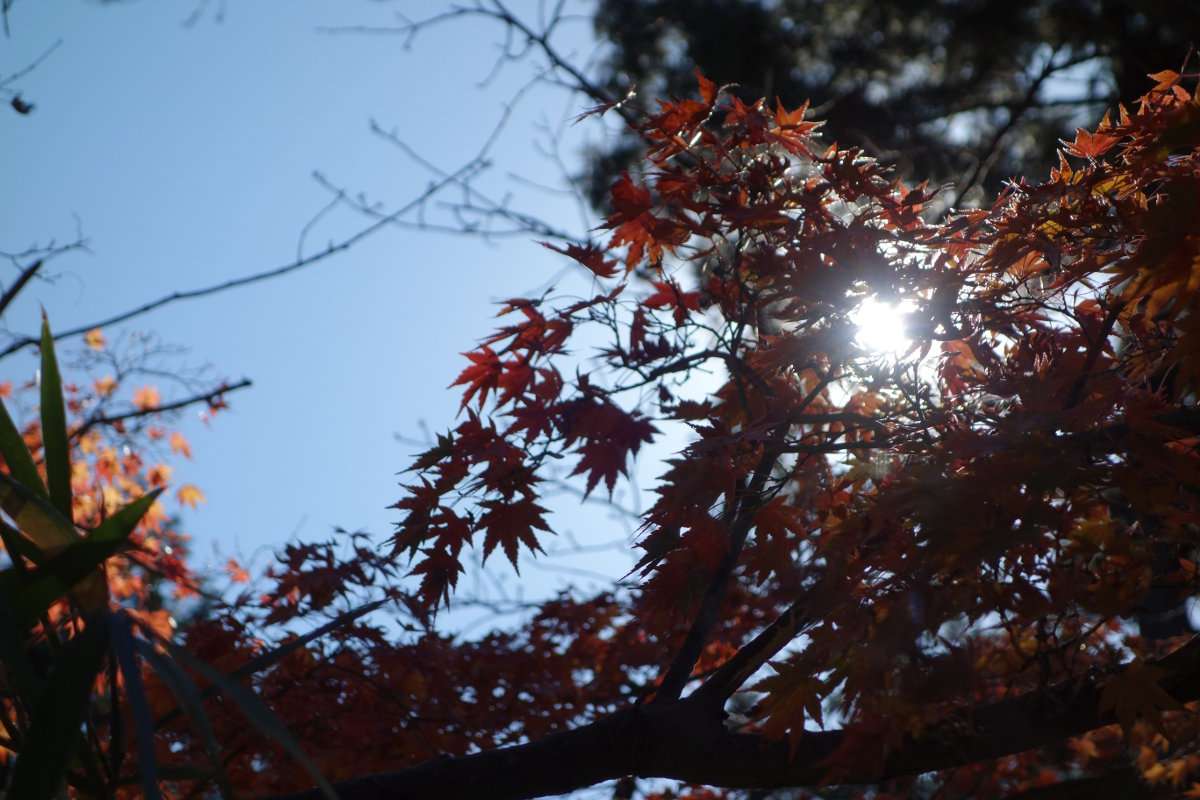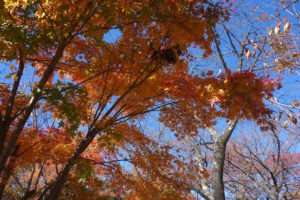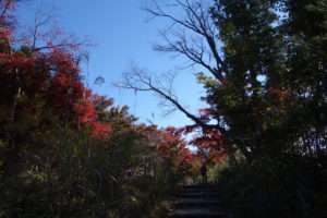 高尾山山頂から城山方面へ向かうと紅葉が見られる下り坂があります。山中全てが紅葉と言うわけではありませんが、赤く染まる紅葉と晴天の青が重なる綺麗な景色が見られます。