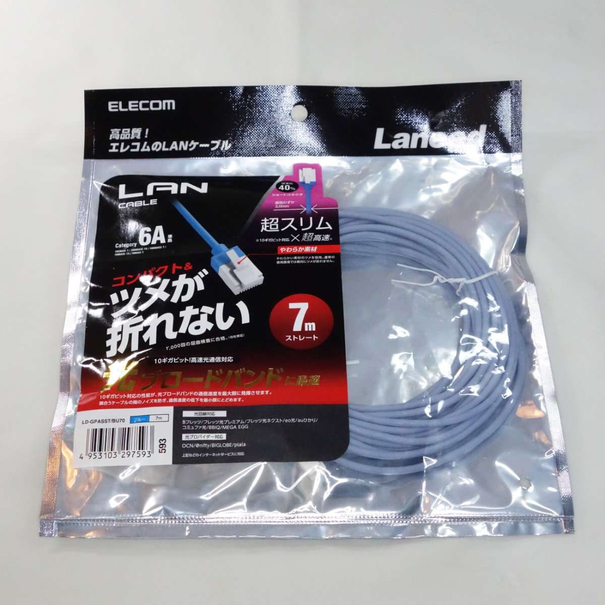 まずは部屋と部屋の間を通すために7mの長いケーブルです。こちらはツメが折れないタイプのコネクターで超スリムのケーブル径がとても細く取り回しがよいケーブルです。ケーブル経が細いだけでなくコネクター部分も小さく全てがコンパクトになっています。