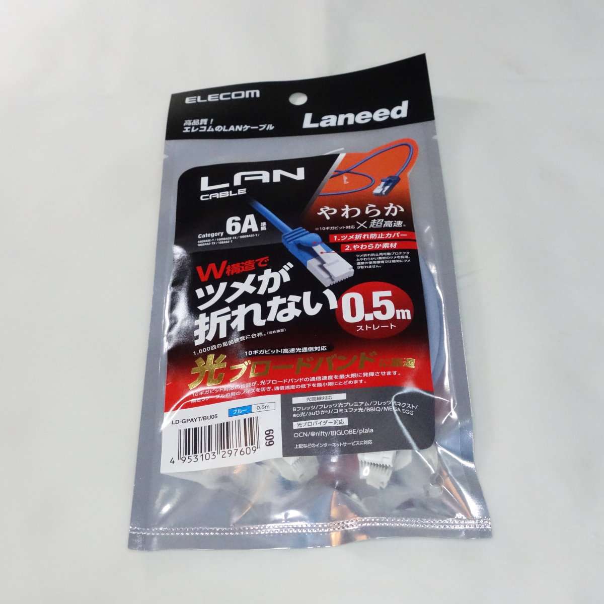 こちらは細いケーブルではなく通常の太さでも以前とは違い非常にやわらかい素材で取り回しがよいタイプです。超スリムと同様にツメが折れないとありますが、コネクターの形状は違い通常のLANケーブルと同様のサイズです。0.5mなのでこちらも接続する機器同士が近い場合に使用します。