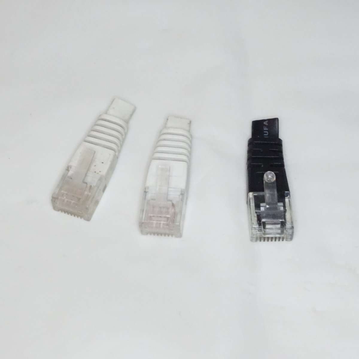 古いLANケーブルもまだ出来ていたのに新しいLANケーブルに入れ替えた理由の1つがこのコネクターです。古いケーブルのコネクターとツメは割れやすい透明のプラスチックで、取り外しの時にすぐパキッと折れる事がよくありました。しかもこれでもツメにカバーが付いて当時はツメが折れにくいと売っていた物です。新しいLANケーブルのコネクターは素材自体が全く違い横に曲げ強度が上がっているのでツメが本当に折れづらくなっています。