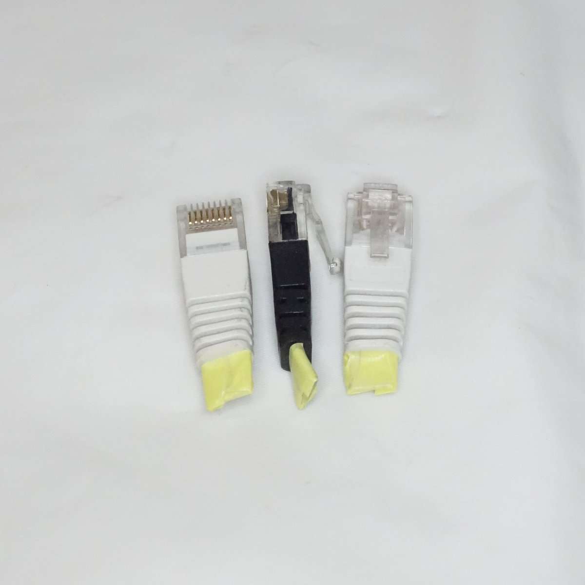 今回取り外したケーブルは端子部分が破損したものとカテゴリーの表記がないものがあり接続スピードがわからずケーブルとして再利用はしない方がよいので、コネクター部分のみをリサイクルします。このコネクターを取り外しハブやルーターの使用していないポート部分に挿し込んでホコリ侵入防止コネクターにします。
