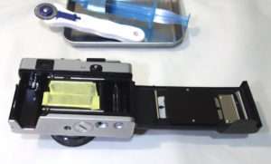 カメラの後ろにあるのはモルト交換に用意した清掃用の無水エタノールが入ったコスメ用の注射器とモルトを切り出すロータリーカッターです