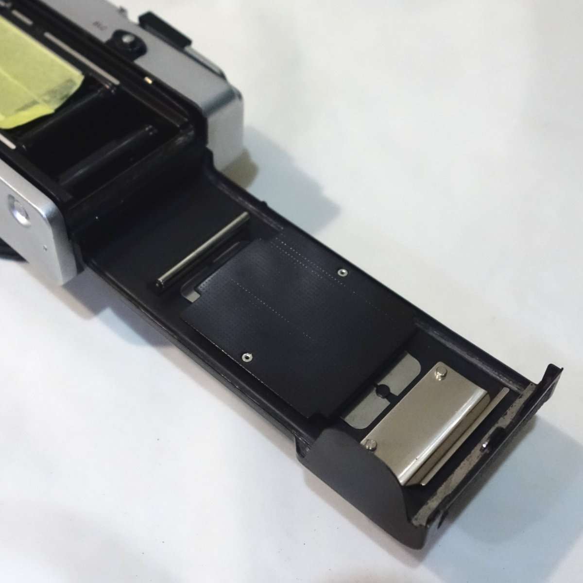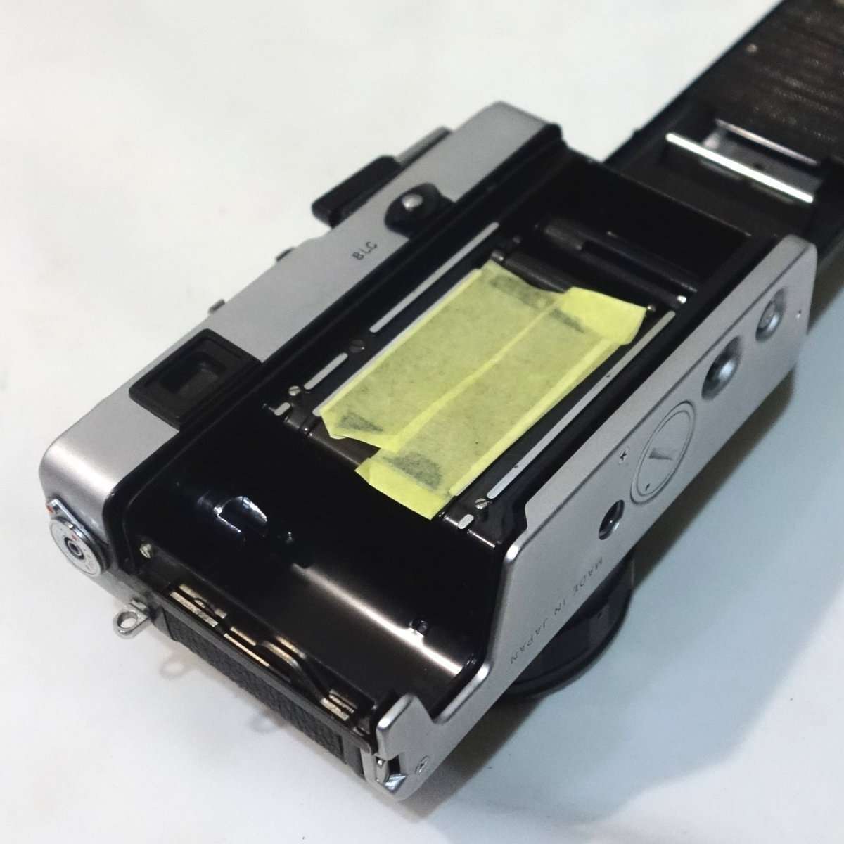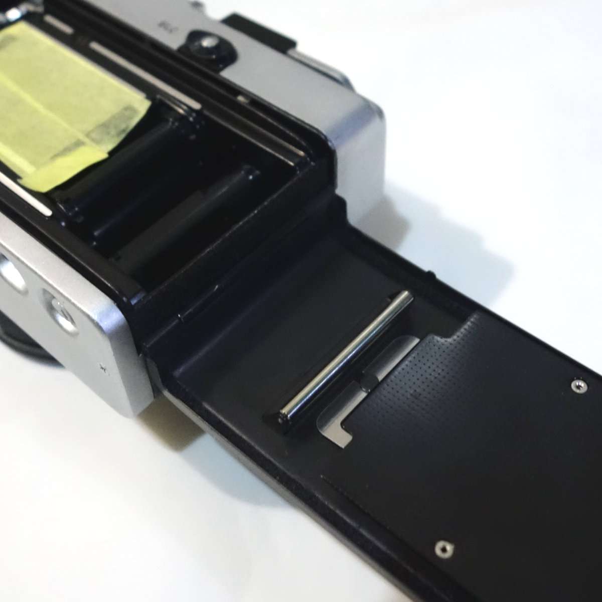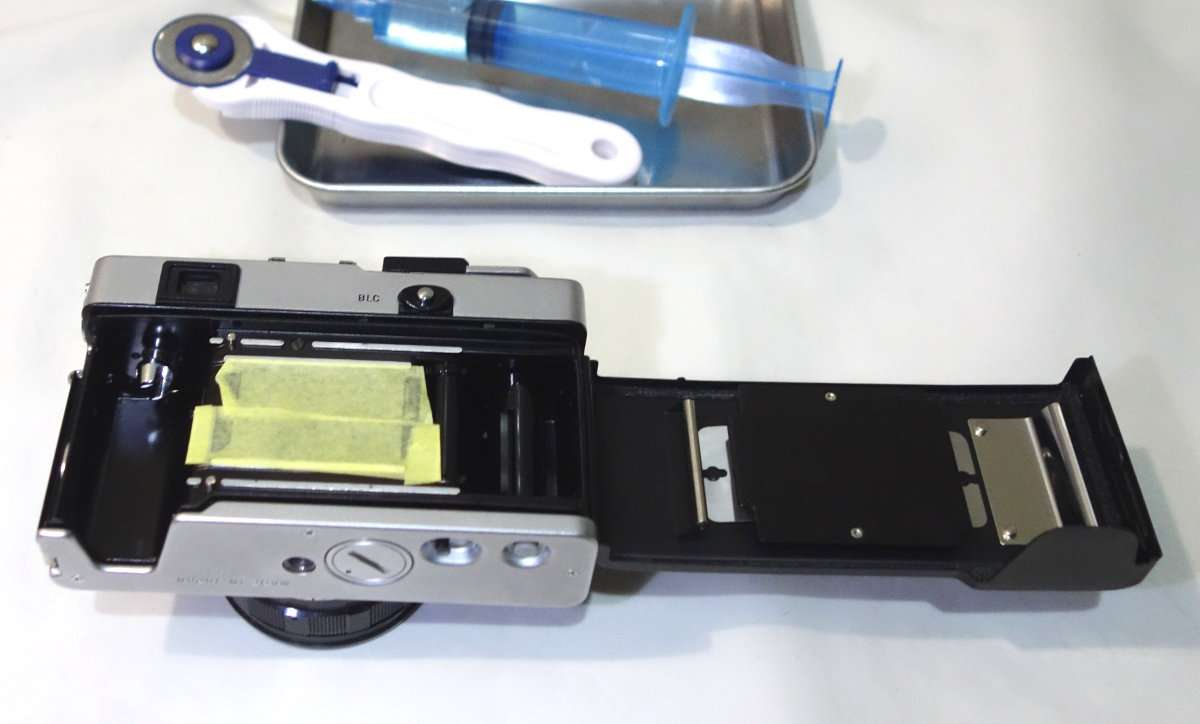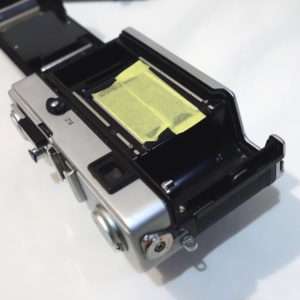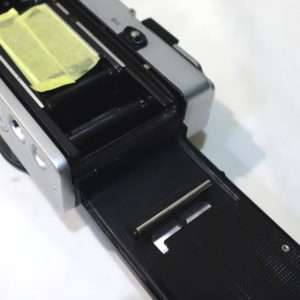 カメラによっては裏蓋やフィルムボックス以外にもモルトが貼られている事があるので確認します。コニカC35は底蓋に小さなモルトがあり、他のレンジファインダーカメラですとトップカバー内にモルトがあったりしますが、この35DCの底蓋にはモルトは使用されていません。底蓋を開けたついでに清掃と各部の確認もしましたが、特に問題もありませんでした。