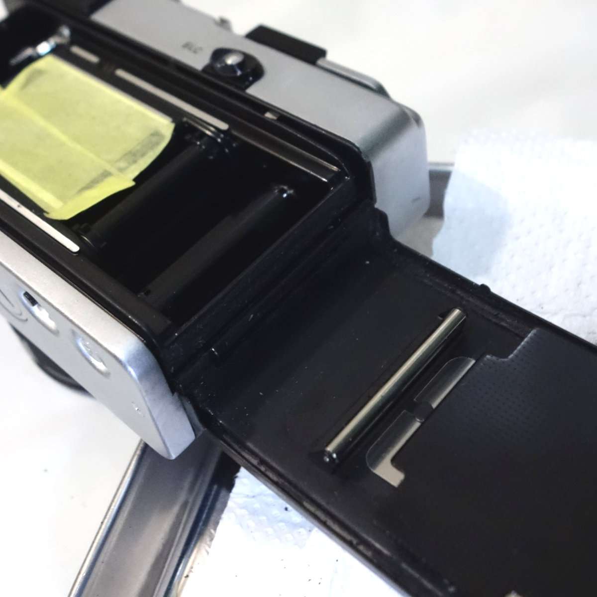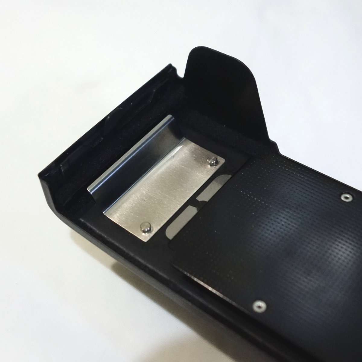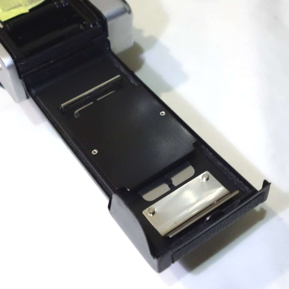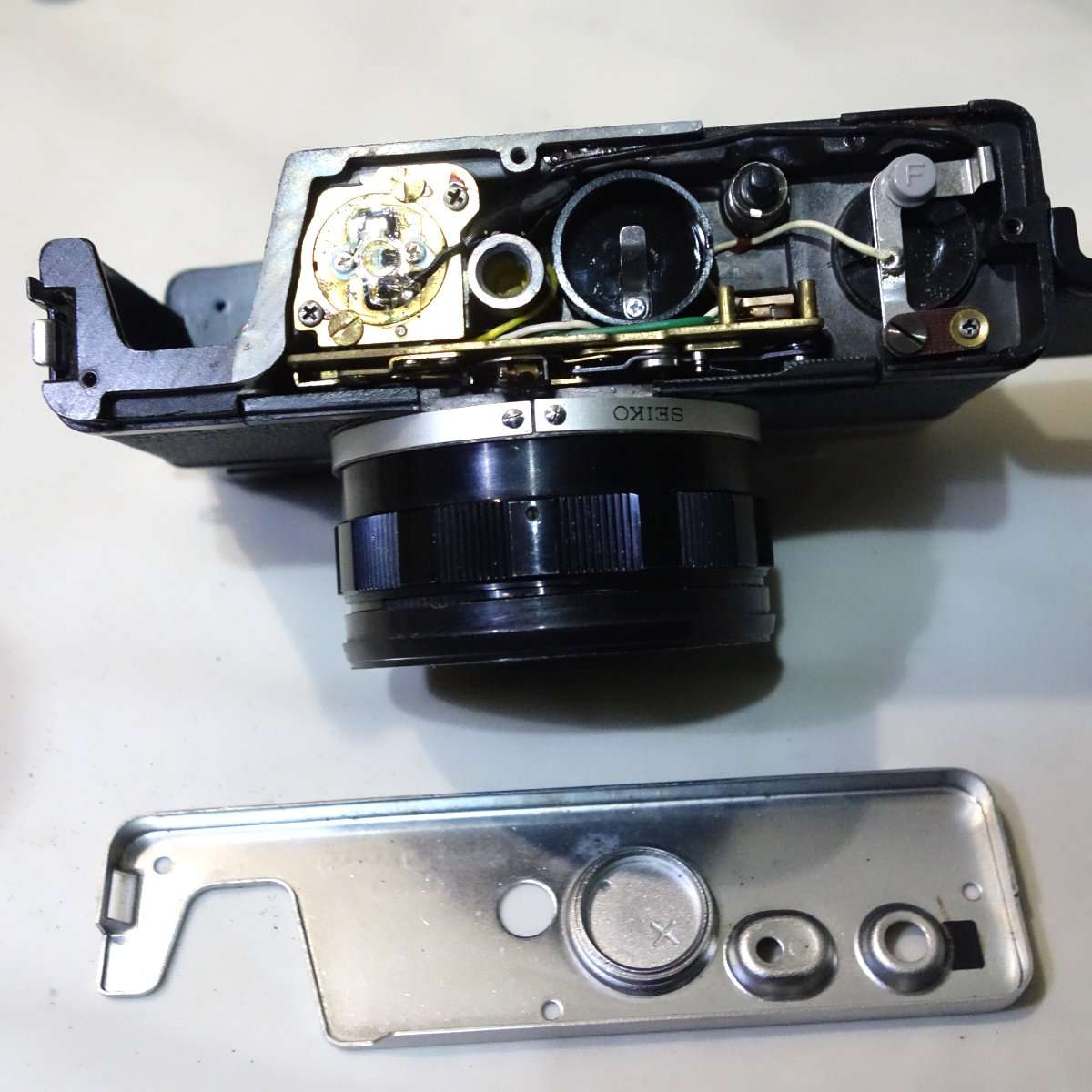 カメラによっては裏蓋やフィルムボックス以外にもモルトが貼られている事があるので確認します。コニカC35は底蓋に小さなモルトがあり、他のレンジファインダーカメラですとトップカバー内にモルトがあったりしますが、この35DCの底蓋にはモルトは使用されていません。底蓋を開けたついでに清掃と各部の確認もしましたが、特に問題もありませんでした。