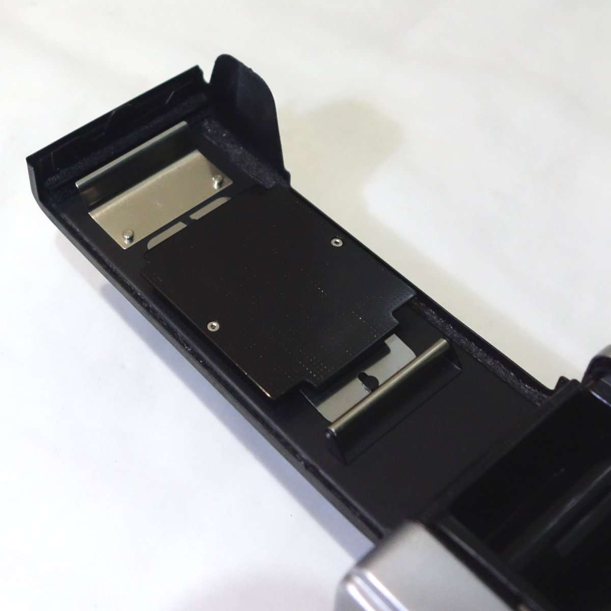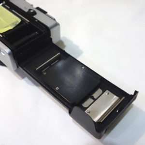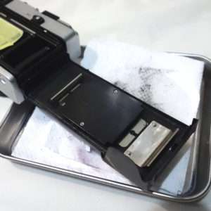 フィルムボックスやモルトがあたっていた部分は金属や塗装部分が劣化してしている事が多いので綺麗にします。この部分はモルトが触れる部分なので多少ざらつきがあっても光線漏れする事はありません。