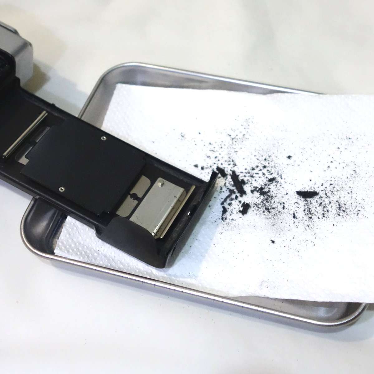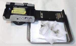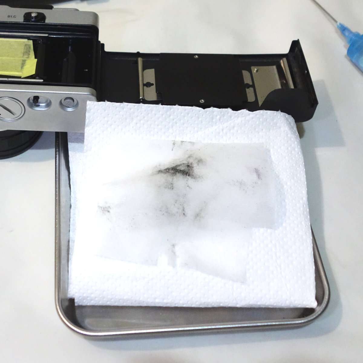 モルトは裏蓋のレール部分に多く貼られているので、清掃するには100円ショップの商品であるコスメ用の注射器に入れた無水エタノールを使うのが便利です。