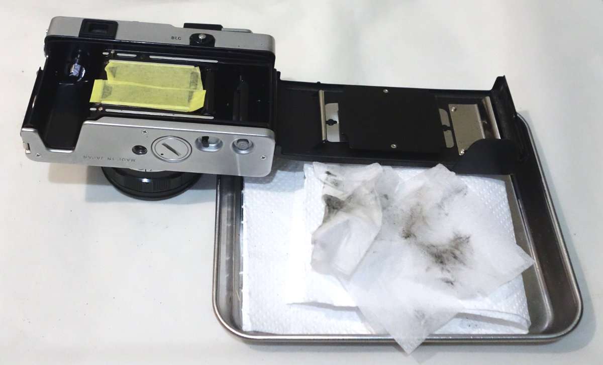 オリンパス35DC(35DC)に限らず国産のほとんどのカメラにはモルト(遮光材)が使用されています。このモルトが劣化する事により内部にある裏蓋の金属部分などが傷んでいきます。最近のモルトは品質もあがり腐食する可能性は減りましたが、45年以上前のカメラでモルトを一度も交換していないカメラなどは開けるのも怖くなるほどになっている場合もあります。ただ、一度綺麗に内部を清掃しモルトを交換してしまえば、当分交換の必要もなくりますし、何より整備の行き届いたカメラを使うのは気持ちがよいものなので、この35DCのモルトも交換する事にしました。