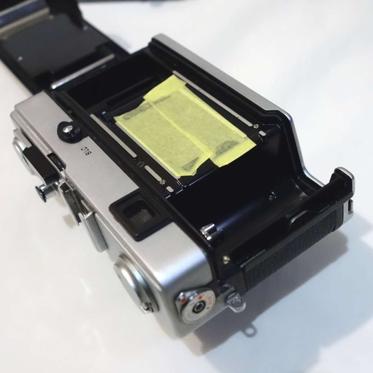 カメラによってモルトが貼られている場所が違いますので、貼ってある(あった)部分を確認します。モルトが古く劣化してほとんどついてない状態の場合でもモルトが触れていた金属部分の劣化でモルトの位置がわかります。この35DCは元々そのままでも撮影が出来るくらいの状態で、元のモルトが残っていました。