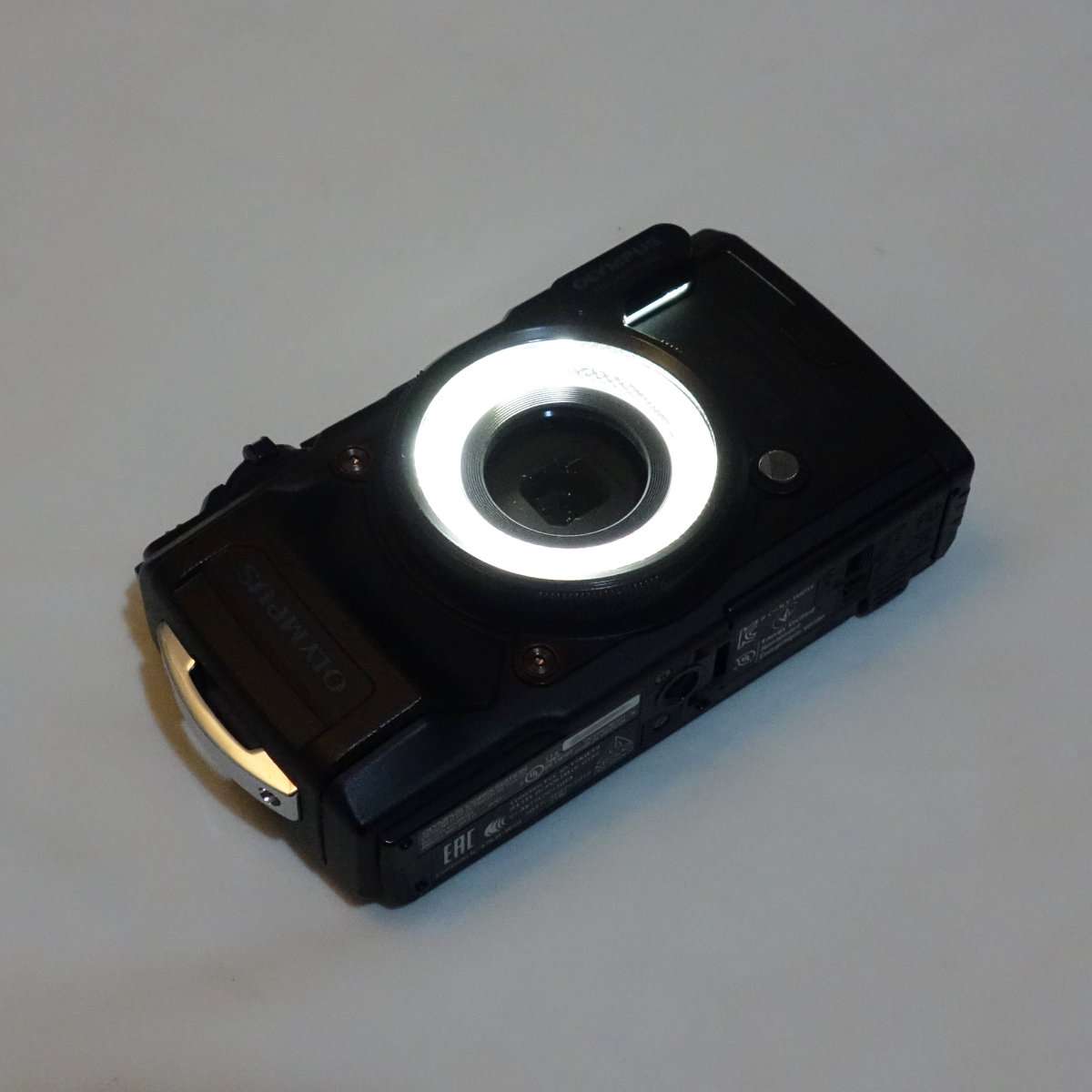 LEDリングを使用するにはTG-6のInfoボタンを長押ししてLEDフラッシュを点灯状態にします。リング自体が発光するわけではなくフラッシュの光をリング部分で拡散させています。LEDライトをオフにする時も同様にInfoボタンを長押しします。