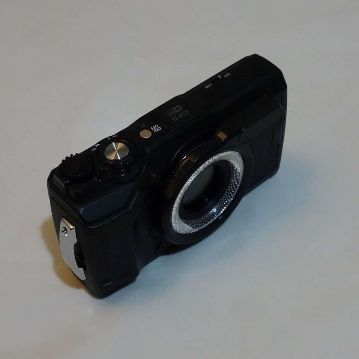 オリンパスTG-6のレンズ右下にあるシルバーのボタンを押すとレンズの周りにあるリングを左に回すとリングを取り外す事が出来ます。レンズ左下に白いドットマークがあるのでそこにLEDリングアダプターを合わせて取り付けて右にロックするまで回すと装着完了です。
