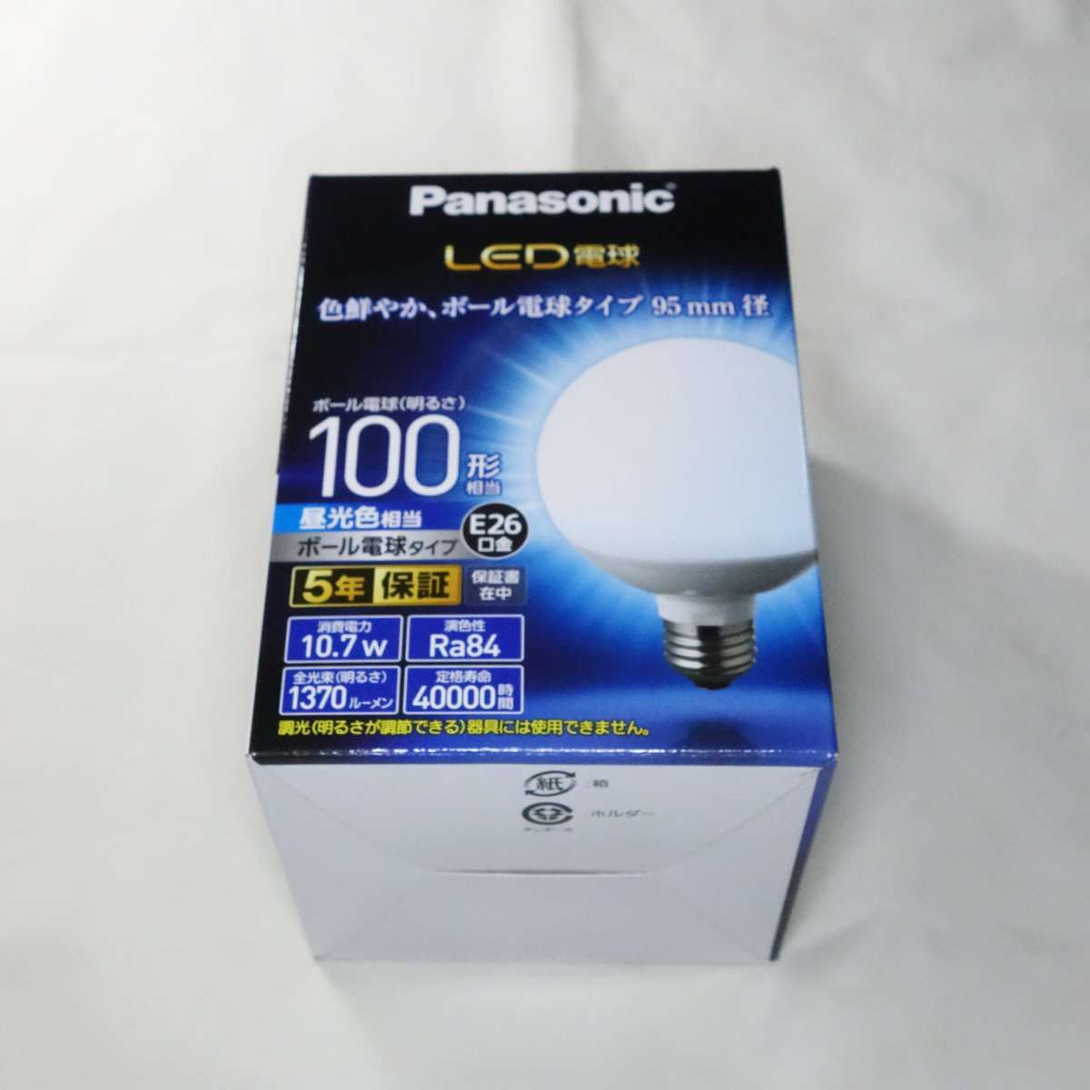 パナソニックのLED電球で100形相当のボール電球タイプで型番LDG11D-G/95/Wです。こちらは昼光色で要はライトのカラーはほぼ白でそのままの色が見やすくなります。そのため食事が美味しく見えるため食卓などの使用に向いています。