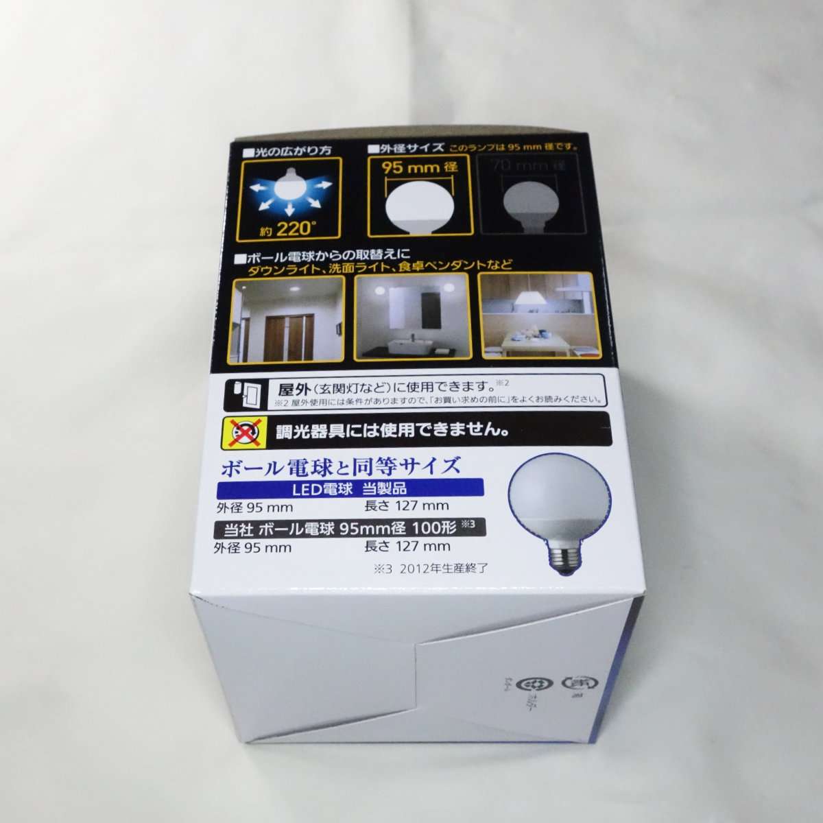 ボール電球タイプと言うだけにこちらはサイズが大きく電球の直径が95mmあり取り付けられるランプシェードなどが限られてきます。こちらも調光器には対応していませんが、玄関灯などの屋外に使用出来ます。