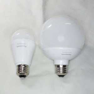 今回選んだのはパナソニックのLED電球で通常の電球タイプ電球色60Wとボール電球タイプ昼光色100Wの2つです。LED電球は消費電力が少ないので100Wの明るさだと100形相当と記載されています。口金は両方ともに通常の形状のE26です。